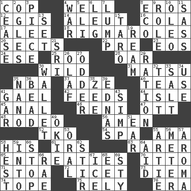 ACROSS 1. Police officer (slang) 4. Not ill 8. Greek god of love 12. Armor plate that protects the chest 14. Native American of Southwest Alaska 16. Root beer relative 17. Toward shelter 18. Frustrating wastes of time 20. Religious groups 22. Before (prefix) 23. Greek goddess of the dawn 24. Compass dir. 25. Friend of Pooh 28. Boat paddle 30. Rampant 31. Taiwanese island in East China Sea 35. Basketball assoc. 37. Edge tool used to cut and shape wood 40. Afternoon social gatherings 41. Highlander 42. Eats 44. Capri or Wight 45. Of or related to the anus 46. Painter Guido (1575-1642) 47. Baseball player Mel 48. Cowboy competition 50. So be it 52. Ring climax 54. Health resort 55. Nanny (var.) 58. Part of HMS, perhaps 61. Big collection agency 63. Less widely known 65. Pleas 70. "Tell ____ the Marines!" 71. Portico 72. It is permitted: Lat. 73. South Vietnam president (1954) 74. Drink excessively 75. Depend 76. Period DOWN 1. Desist 2. Stares 3. Component 4. Armed conflict 5. Biblical high priest 6. Part of a journey 7. Mass 8. Environmental prefix 9. Hero or heavy, e.g. 10. Margarine 11. Backtalk 13. Arrange properly for use 15. Edible starchy tuberous root 19. 480, 500 or 516 sheets of paper 21. _ Lanka 26. Norwegian king 27. More peculiar 29. Food allowance for one day 30. Place for singles 32. Trial 33. Table seasoning 34. Purpose 35. Billionth: prefix 36. Necklace unit 38. Last letter of the English alphabet 39. Ferber et al. 41. Slender fish 43. Simple or foolish person 49. Migrant worker of the '30s 51. Ewer handle 53. Relating to the mouth 55. Nick name for Arthur 56. Distance measurement 57. Scent 58. Command 59. To the inside or interior of 60. Halt 62. Use a swizzle stick 64. Assist 66. Actress Charlotte 67. Frozen water 68. Snakelike fish 69. Filthy place