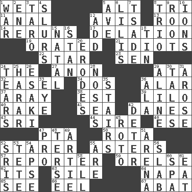 ACROSS 1. Soaks 5. The first octave above the treble staff 8. Three (prefix) 11. Of or related to the anus 12. Deliberation 13. Friend of Pooh 14. Summer TV shows 17. Accusation by an informer 19. Spoke pompously 21. Foolish or stupid persons 22. Play the lead 23. Elected rep. 24. Definite Article 27. At once, immediately (arch.) 29. "One Day ___ Time" 32. Artist's stand 34. Two (Sp.) 36. Having or resembling wings 37. Like ___ of sunshine 38. Eastern Standard Time (abbr.) 39. _ and Stitch 40. Libertine 41. Ocean 42. Natives or inhabitants of Denmark 43. Indian title of respect (Mr.) 44. Title for a man of rank and authority 46. Compass dir. 47. Parent Teacher Assoc. 50. Round or rotation of duties 52. A viewer who gazes fixedly 55. Michaelmas daisies 57. Newsperson 59. Threatening words 62. ___ a Wonderful Life 63. Drop; flow; fall 64. California wine valley 65. Perceive with the eye 66. Snakelike fish 67. Blind as ____ DOWN 1. Armed conflict 2. Compass dir. 3. Edible starchy tuberous root 4. Runs notes together 5. "___ Maria" 6. Ms. Damita and namesakes 7. Sadhe (variant) 8. Musical group of three 9. Carrot, for example 10. Charged particles 12. Increase 15. Brizilian seaport 16. Comedian Laurel of Laurel & Hardy 18. Metal container 20. Eats (away) 24. Pulls into pieces 25. Ethiopian city, capital of Harari 26. 1973 Nobel Price Winner (Physics) Leo 28. Olfactory organs 29. Place in a line 30. Stories 31. Came up 33. Sight organ 35. Flight of steps 36. Insect wing 42. Prevent from occurring 45. Printing process, for short 47. Adept person 48. Laconic 49. Nick name for Arthur 51. Sports stadium 52. Indian titles of respect 53. Wig 54. Domed church section 55. "We ___ not amused" (Victoria) 56. Thick slice 58. Pipe bend 60. Health resort 61. Consume