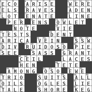 ACROSS 1. Environmental prefix 4. Originate 9. Past tense of be (plural) 13. Raised railways 14. All-night dance parties 15. An important port of Yemen 16. Car dealer's back yard 17. Related on the mother's side 18. Actor's bit 19. For each 21. Followers of ems 22. A small or young owl 24. Musical sound 26. Compete 27. Trials 29. Gouge 30. N. Chile seaport 31. Distinctive style or manner 33. Compass dir. 36. HTML Container Element 37. Noisy, rowdy, vocal (Spanish) 40. Sliced dessert 41. Perceive with the eye 42. Backtalk 43. Let have 45. To provide with a ceiling 47. Shoestrings 48. Layer 49. False hair 50. Amid 52. Bear (Spanish) 54. She-sheep 56. Musical group of three 57. Sets or collections 59. 100% 61. Petroleums 62. Stares 63. Whopper 64. Lie 65. Dinah or Pauly 66. Cask DOWN 1. Snakelike fish 2. Hoof sound 3. Clearly or manifestly demonstrative 4. "We ___ not amused" (Victoria) 5. Indian princess (variant) 6. _ the terrible 7. Arranges properly for use 8. Compass dir. 9. Place for singles 10. Singer Brickell 11. Monthly bill 12. Compass dir. 20. College mil. group 22. Baking chambers 23. Victory 25. Russian ruler of old 27. Bits 28. One of the Great Lakes 29. "Vaya con ____" 31. Small bottle 32. Begley and Asner 33. High altitude stroll 34. Trig term 35. Soaks 38. Putting into practice 39. Stare 44. Pace 45. Opt 46. Car or cant ending 49. Carrier 50. Operatic vocal solo 51. Place where flour is made 52. Ending for "Through" and "Enough" 53. Grain storage tower 55. Writer Wiesel 56. Small child 57. Mayday 58. Compass dir. 60. Part of a journey