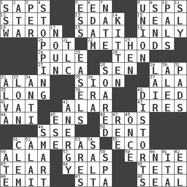 ACROSS 1. Plant excrements 5. Car or cant ending 8. United States Postal Service (abbr.) 12. Proofreading order 13. Neighbor of Neb. 15. Anneal 16. Make _____ (do battle with) 18. Suttee (variant) 19. In an inward manner 20. Cooking vessel 22. Modes 24. Whimper 26. Nine, plus one 27. South American Indian 28. Elected rep. 29. Infant locale 32. ____ Jay Lerner 35. The Jewish people; Israel 37. According to 38. Yearn 39. Epoch 40. Passed on 41. Large container 42. Having or resembling wings 43. Angers 44. Cuckoo 45. Followers of ems 46. Greek god of love 49. Compass dir. 50. Undesirable depression on a surface 51. Devices for capturing images 55. Environmental prefix 56. Silent film actress Nazimova 57. Pate de foie ____ 59. Bert's buddy 63. Lacerate 64. Sharp bark 65. Wig 66. Give off 67. R.R. building 68. Lick closed DOWN 1. Compass dir. 2. "One Day ___ Time" 3. For each 4. Halting 5. Curvy letter 6. Dutch treat 7. Nathan's nickname 8. The state of being joined or united 9. Post 10. Friends 11. Playfully artful 14. Baby cat 17. Part of speech 21. Affectionate concern, for short 23. Layer 25. Artist's stands 28. Flew 29. Den 30. Toward shelter 31. Writing tablets 32. Inventor's middle name 33. Grant temporary use of 34. Against 36. Lyricist Gershwin 40. What propaganda does 42. Disorder of the immune system 45. Compass dir. 47. To sift 48. Single time 49. Don Adams' spy role 51. Clement's nick name 52. Mountain range southwest of Kyrgyzstan 53. Ancient Greek god of war 54. Table seasoning 56. Had dinner 58. Health resort 60. Born 61. Call ___ day 62. Snakelike fish