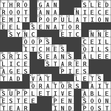 ACROSS 1. Through, poetically 5. Separate the seeds from cotton 8. Downhill vehicle 12. Carrot, for example 13. Santa ___, CA 14. Sibling's daughter 15. Give off 16. Census information 19. Snakelike fish 20. Elected representative 21. Synchronize (abbr.) 23. And so on (abbr.) 24. Compass dir. 27. I made a mistake 30. To provide with a ceiling 31. Skin irritations 34. Petroleums 35. Indian titles of respect 38. Seines 40. Toward shelter 41. Louse (plural) 42. A viewer who gazes fixedly 44. Matures 45. Sliced desserts 46. Small boy 47. Large container 50. Allows 53. Speakers 57. Small island 59. Supplying deficiencies 63. Competent 64. First name in cosmetics 65. Fenced enclosure 66. Within a short period 67. Rend 68. Indiana (abbr.) 69. Mail DOWN 1. Relationship diagram 2. Residences 3. Agitated, as a liquid 4. Baseball player Mel 5. Open wide 6. At once, immediately (arch.) 7. California wine valley 8. Be seated 9. Luau accessory 10. Environmental prefix 11. Lair 14. Drug cop 17. Shoshoni 18. Car dealer's back yard 20. Native of Scotland 22. Annoying sounds 24. Famous astronaut Armstrong 25. "Death on the ____" 26. Otherwise 28. Personal Computers (abbr.) 29. "______ My Girl" (Turtles hit) 30. Unrefined 32. Erode 33. Fastener 35. Narrow board 36. Port city in Latvia 37. On the rocks 39. _ Lanka 43. Snakelike fish 47. Grand slam 48. "We ___ not amused" (Victoria) 49. Make lace 51. Off limits 52. Grain storage towers 54. Native american tent (variation) 55. Baking chamber 56. Tear apart 58. Portable shelter 59. Arrange properly for use 60. Purpose 61. Parent Teacher Association (abbr.) 62. For each 63. Cleo's killer