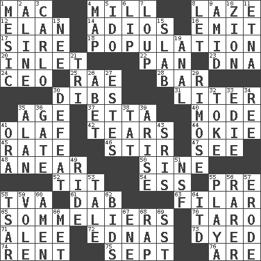 ACROSS 1. Big _ 4. Place where flour is made 8. Goldbrick 12. Enthusiasm 14. Goodbye (Sp.) 16. Send forth 17. Beget 18. Census information 20. An arm off of a larger body of water 22. Baking dish 23. Heredity factor (abbr.) 24. Corporate head (abbr.) 25. Actress Charlotte 28. Long, evenly shaped piece 30. Claim 31. 61 cubic inches 35. Personal question 37. Singer James 40. Method 41. Norwegian king 42. Rends 44. Migrant worker of the '30s 45. Assign a rank or rating to 46. Move through with a circular motion 47. Observe 48. Approach 50. Trig term 52. Teat (slang) 54. Curvy letter 55. Before (prefix) 58. Federal power corp. 61. Apply (a substance) by light strokes 63. Of or pertaining to a thread or threads 65. Wine waiters 70. Pacific island yam 71. Toward shelter 72. Ferber et al. 73. Colored 74. Monthly bill 75. Back-to-school mo. 76. "We ___ not amused" (Victoria) DOWN 1. Mesonic 2. Place in a line 3. Monte _, Las Vegas Hotel/Casino 4. Atlas unit 5. Wedding promise 6. Mouth edge 7. Central Nebraska county 8. Allow 9. Among 10. The Jewish people; Israel 11. Inactive volcano in Sicily 13. Born 15. Thick slice 19. Of or related to the anus 21. Three (prefix) 26. Collude with 27. _____ Park, CO 29. Full of chinks, cracks, or crevices 30. Outscore 32. Puff or smoke 33. Singer Brickell 34. To separate or throw off 35. Actor Alda or Thicke 36. Yard entry 38. Make lace 39. Originate 41. Mouth or opening 43. Indian titles of respect 49. Travel on or in a vehicle 51. Overdraft (abbr.) 53. Lie 55. Beach, in Buenos Aires 56. More uncommon 57. Eat (away) 58. Russian ruler of old 59. Short-tailed, large-bodied rat 60. So be it 62. Auction offers 64. It would 66. Was introduced to 67. Compass dir. 68. Reproach for some lapse or misdeed 69. Fast jet (abbr.)