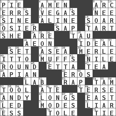 ACROSS 1. Sliced dessert 4. So be it 8. Curve 11. Blunders 13. Viva Las _ 15. Born 16. Trig term 17. Place in a line 18. Fly high 19. Flexible twig of a willow tree 21. Plant excrement 22. Small pie 23. A female animal or person 24. "We ___ not amused" (Victoria) 27. The 19th letter of the Greek alphabet 29. Period of immesurable duration 30. Standard of perfection 34. Arrange properly for use 36. At sea 39. Haggard of country music 40. "Tell ____ the Marines!" 41. Performs or handles clumsily 43. "Death on the ____" 44. Unit of ammunition 46. Singer James 47. Afternoon social gathering 48. Bee-related 49. Greek god of love 51. Experiment locale 53. Hit sharply and swiftly 54. Scottish cap 57. Implement 60. Had dinner 63. Laconic 65. "60 Minutes" Commentator Rooney 66. Yearns 69. Compass direction 70. Directed 71. Methods 72. One who doesn't tell the truth 73. Curvy letter 74. Lacquered or enameled metalware 75. Neckwear DOWN 1. Mexican monetary units 2. From or relating to Ireland 3. Bert's buddy 4. Actress Gardner 5. Cartoonist voice _ Blanc 6. Armor plate that protects the chest 7. Nanny 8. Small Philippine buffalo 9. Bring up, as a child 10. An absolute certainty 12. Observe 14. Back-to-school mo. 18. SAT takers 20. Actress Charlotte 25. Wander 26. Take place subsequently 28. Direct toward a target or goal 29. Without tonality 31. 4th largest of the Great Lakes 32. Silent film actress Nazimova 33. Area sheltered from the wind 34. Close up, plug up 35. Needle holder 37. Lizard (obsolete) 38. Following 40. Lyricist Gershwin 42. "Two Mules for Sister ____" 45. Heredity factor (abbr.) 50. Choose 52. Lip ointment 54. Distinguishing feature 55. Slender Brazilian palm 56. Distance measurement (Brit.) 57. Falsehood 58. Singles 59. Likelihood 61. A blast of a horn 62. Inside; within (prefix) 64. Snakelike fish 67. Set 68. Compass dir.