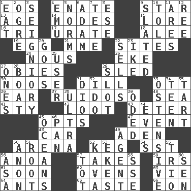 ACROSS 1. Greek goddess of the dawn 4. Related on the mother's side 9. Play the lead 13. Grow older 14. Methods 15. Old wives' tales, e.g. 16. Three (prefix) 17. A salt of uric acid 18. Toward shelter 19. Ovum 21. Madame (abbr.) 22. Locates 24. Common sense 26. Supplement with great effort 27. Off-Broadway awards 29. Downhill vehicle 30. Trap for birds or small mammals 31. Deli pickle 33. Baseball player Mel 36. Ewer handle 37. Boisterous (Brazilian Portuguese) 40. Ocean 41. Filthy place 42. Spoils 43. Prevent from occurring 45. Elects 47. Incident 48. Automobile 49. An important port of Yemen 50. Sports stadium 52. Cask 54. Fast jet (abbr.) 56. Small Philippine buffalo 57. Proceeds 59. Big collection agency 61. Within a short period 62. Baking chambers 63. Compete 64. Pismires 65. Clothes sense 66. Period of immesurable duration DOWN 1. Ingest 2. Legendary monster 3. Signiory (variant) 4. Australian flightless bird 5. Typical standards 6. First man 7. Wig 8. Compass dir. 9. Scheduled 10. Lacquered or enameled metalware 11. Ancient Greek god of war 12. To riddle 20. Moves 22. Makes a sale 23. Mamie's mate 25. One who uses or employs something 27. Singles 28. Water vessel 29. Position in a hierarchy or organization 31. "Vaya con ____" 32. Wedding promise 33. Clearly or manifestly demonstrative 34. Adolescent 35. Small pie 38. Extremist 39. Wrote a lyric poem 44. Nights before holidays 45. Seas 46. Baking dish 49. Rep 50. At once, immediately (arch.) 51. Carrot, for example 52. Polynesian shrub of the pepper family 53. Supplements with great effort 55. Musical group of three 56. White ___ sheet 57. Small child 58. Compass dir. 60. Elected rep.