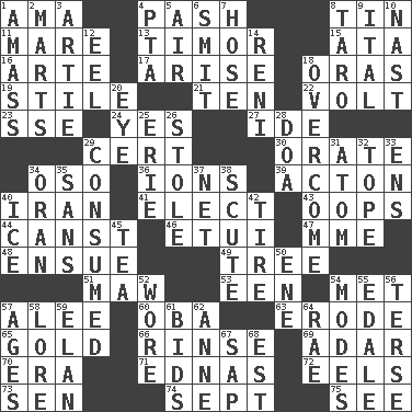 ACROSS 1. Nanny (var.) 4. Romantic infatuation 8. Shallow baking pan 11. Female horse 13. Southeast Indonesia island 15. "One Day ___ Time" 16. Johnson of "Laugh-In" 17. Ascend 18. Mouths or openings 19. Vertical member of a panel or frame 21. Nine, plus one 22. Electrical Unit 23. Compass dir. 24. It is so 27. Binary compound 29. Foregone conclusion 30. Declaim 34. Bear (Spanish) 36. Charged atoms 39. Gambison 40. SW Asia republic 41. Voters do this 43. I made a mistake 44. 2nd pers. sing. pres. of can (arch.) 46. Needle holder 47. Madame (abbr.) 48. Take place subsequently 49. Family _ (genealogy) 51. Informal term for the mouth 53. Car or cant ending 54. Was introduced to 57. Toward shelter 60. Chief or king in Benin or Nigeria 63. Eat (away) 65. Gilt 66. Wash lightly 69. The sixth month of the Jewish calendar 70. Period 71. Ferber et al. 72. Snakelike fish 73. Elected rep. 74. Back-to-school mo. 75. Observe DOWN 1. Collect or gather 2. Shops 3. Nick name for Arthur 4. Parent Teacher Assoc. 5. Wind 6. Stricken, poetically 7. Stockings 8. Edible starchy tuberous root 9. Slanted text style (abbr.) 10. Political cartoonist Thomas 12. Snakelike fish 14. Painter Guido (1575-1642) 18. Conquer 20. Sight organ 25. One of the Great Lakes 26. Took without asking 28. ___ good deed 29. Ingested 31. Smallest unit of an element 32. Drink excessively 33. Followers of ems 34. NW Algerian seaport 35. Without 37. Fish or hair follower 38. Snake scale 40. Frozen water 42. Become fatigued 45. Afternoon social gathering 50. Compass dir. 52. Had on 54. Methods 55. Peak District village in England 56. Laconic 57. Ripens 58. Old wives' tales, e.g. 59. Flair 61. Auction offers 62. Singer Murray 64. Actress Charlotte 67. Plant excrement 68. Eastern Standard Time (abbr.)