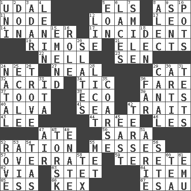 ACROSS 1. Allodial 5. Raised railways 8. Viper 11. Thickened enlargement 12. Rich soil 13. Lion 14. Sillier 17. Event 19. Full of chinks, cracks, or crevices 21. Chooses 22. 1994 drama film starring Jodie Foster 23. Elected rep. 24. Fish or hair follower 27. Anneal 29. Domesticated feline 32. Bitter 34. Nervous spasm 36. Conductor's collection 37. A blast of a horn 38. Environmental prefix 39. Pismires 40. Inventor's middle name 41. Ocean 42. Distinguishing feature 43. Area sheltered from the wind 44. Relationship diagram 46. French article 47. Had dinner 50. "Two Mules for Sister ____" 52. Food allowance for one day 55. Makes clutter 57. Make much ado about nothing 59. Cylindrical with tapered ends 62. By way of 63. Proofreading order 64. Detail 65. Double-curved letter 66. A weed 67. Son of Isaac DOWN 1. University (slang) 2. Spanish title 3. The sixth month of the Jewish calendar 4. Soviet premier 1918-24 5. Period of immesurable duration 6. Shoestrings 7. Grin 8. Actor Baldwin 9. Emitted 10. Plant holders 12. Untruth 15. Make improvements or corrections to 16. Hero or heavy, e.g. 18. Lair 20. Chalkboards 24. Brizilian seaport 25. Learning spot: Fr. 26. Collection of objects 28. It is permitted: Lat. 29. Lessep's creation 30. Nick name for Arthur 31. Trials 33. Call ___ day 35. Rough 36. Distant 42. Laconic 45. 90 degrees 47. Wind 48. Cod relative 49. Related on the mother's side 51. Nest on high 52. Be footloose 53. Opinion 54. Afternoon social gatherings 55. Was introduced to 56. Puts into a specified state 58. John Ritter's dad 60. Afternoon social gathering 61. Australian flightless bird