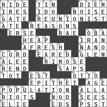 ACROSS 1. Travel on an animal 5. Metal container 8. South Vietnam president (1954) 12. Angers 13. Wedding promise 14. Annoying sound 15. Yard entry 16. One who advocates reunion 19. Had dinner 20. Thinks logically 21. Celtic language 23. Actress Charlotte 24. Chief or king in Benin or Nigeria 27. Pile 30. SW Asia republic 31. Anew 34. Billionth: prefix 35. Drawstring 38. Having ears or earlike features 40. Small, secluded valley 41. Toward shelter 42. Full of chinks, cracks, or crevices 44. Tear apart 45. Plant excrements 46. Small child 47. Eastern Standard Time (abbr.) 50. "Beetle Bailey" pooch 53. Curse 57. Personal question 59. Census information 63. Silent film actress Nazimova 64. Disturbances 65. Allow head to fall sleepily 66. Perceives with the eye 67. Writer Wiesel 68. Begley and Asner 69. Inconspicuous attention getter DOWN 1. Capital of Latvia 2. Feeling or showing extreme anger 3. Prevent from occurring 4. Compass dir. 5. Hoop that covers a wheel 6. It may be bright or harebrained 7. Horse sense 8. Spanish title 9. One more than two 10. Double-curved letter 11. Was introduced to 14. Characteristic smell of wine 17. Not either 18. _ tizzy (2 wds.) 20. Coral collection 22. Cast a shadow over 24. Taken by mouth 25. Object of repulsion 26. Soon (poet.) 28. "We ___ not amused" (Victoria) 29. Lightbulb-shaped fruit 30. Eat 32. _ Lanka 33. Folds over and sews together 35. Haul 36. Butter sub 37. Monthly bill 39. ___ good deed 43. Blemish 47. Snakelike fish 48. Health resort 49. Teat (slang) 51. Falsehoods 52. Stares 54. Prong on a fork 55. Parka part 56. Conclusions 58. 90 degrees 59. Before (prefix) 60. Lubricate 61. Luau course 62. Shoshoni 63. Cleo's killer