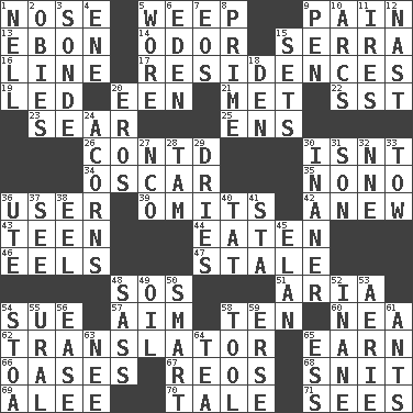 ACROSS 1. Olfactory organ 5. Shed a tear 9. Ache 13. Inky black, to poets 14. Aroma 15. Spanish missionary in California 16. Actor's bit 17. Homes 19. Directed 20. Car or cant ending 21. Was introduced to 22. Fast jet (abbr.) 23. Shrivel 25. Followers of ems 26. Continued (abbr.) 30. Is not 34. Motion picture award 35. Words to Nanette 36. One who makes use of a thing 39. Leaves out 42. Afresh 43. Adolescent 44. Eroded 46. Snakelike fish 47. Lacking originality or spontaneity 48. Distress signal 51. Roberta Peters solo 54. Take to court 57. Direct toward a target or goal 58. "___ Little Indians" 60. Teachers' org. 62. Interpreter 65. Merit 66. Fertile tracts in a desert 67. Vintage cars 68. In a ____ (agitated or irritated) 69. Toward shelter 70. Lie 71. Observes DOWN 1. 1994 drama film starring Jodie Foster 2. Off-Broadway awards 3. Message 4. Compass dir. 5. Had on 6. Locale of original sin 7. Greek goddess of the dawn 8. A-one 9. Animal enclosure 10. Curves 11. Angers 12. Political cartoonist Thomas 15. Arranges properly for use 18. Lair 20. Greek god of love 24. Oak nuts 27. Non-commissioned officer (abbr.) 28. Scottish cap 29. Frees from moisture 30. Sillier 31. Boy, to dad 32. Compass dir. 33. Pull behind 36. Shoshoni 37. Observe 38. Snakelike fish 40. Make lace 41. R.R. building 45. Liveliness 48. Backtalk 49. Petroleum 50. Don Adams' spy role 52. Silly 53. Nest on high 54. Portico 55. Mountain range 56. Relaxation 58. Utensil 59. Celtic language 61. Pismires 63. Born 64. Afternoon social gathering 65. Double-curved letter