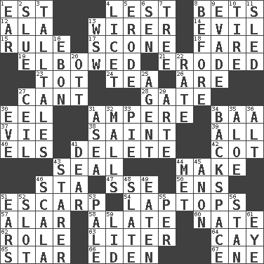 ACROSS 1. Eastern Standard Time (abbr.) 4. For fear that 8. Wagers 12. Wing 13. One who wires 14. Morally bad or wrong 15. General guideline 17. Biscuitlike quick bread 18. Conductor's collection 19. Turned at an angle; bent 21. Eaten away 23. Small child 24. Afternoon social gathering 26. "We ___ not amused" (Victoria) 27. Patter 28. Yard entry 30. Snakelike fish 31. Electrical Unit 34. Sound made by sheep 37. Compete 38. Inhabitant of Heaven 39. 100% 40. Raised railways 41. Erase 42. Small bed 43. Lick closed 44. Create 46. R.R. building 47. Compass dir. 50. Followers of ems 51. Fortification 54. Portable computers 57. Having or resembling wings 58. Having winglike extensions 60. Nathan's nickname 62. Hero or heavy, e.g. 63. 61 cubic inches 64. Island 65. Play the lead 66. Genesis locale 67. Compass dir. DOWN 1. Ewer handle 2. Turn sharply 3. Baron Munchausen's specialties 4. It is permitted: Lat. 5. Eat (away) 6. Elected rep. 7. Woody plant 8. Prior to 9. Dodge 10. Become fatigued 11. Downhill vehicle 13. Compass dir. 16. Inky black, to poets 20. Baseball player Mel 22. Assign a rank or rating to 25. Representative 27. To provide with a ceiling 29. Johnson of "Laugh-In" 30. Night before a holiday 31. At sea 32. Promenades 33. Sliced dessert 34. Keyboard key 35. _ vera 36. Keyboard modifier key 41. Letter starter 43. A viewer who gazes fixedly 44. Was introduced to 45. Soon (poet.) 46. Any of the three canals of the cochlea 48. Chalkboard 49. Ingested 51. Hearing organs 52. Slit 53. Light colored 55. For each 56. Comedian Laurel of Laurel & Hardy 59. Flaplike covering 61. Sight organ