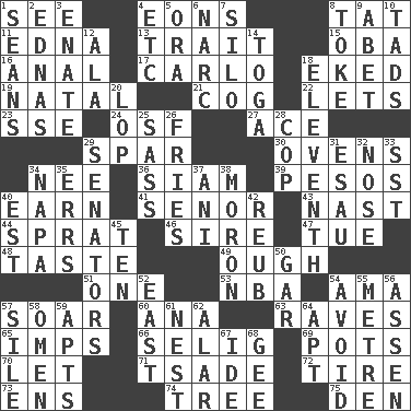 ACROSS 1. Observe 4. Immeasurably long periods of time 8. Make lace 11. Pulitzer Prize-winning author Ferber 13. Distinguishing feature 15. Chief or king in Benin or Nigeria 16. Of or related to the anus 17. Monte _, Las Vegas Hotel/Casino 18. Made supply last 19. Brizilian seaport 21. Gear tooth 22. Allows 23. Compass dir. 24. Order of Saint Francis (abbr.) 27. Adept person 29. Coast Guard woman 30. Baking chambers 34. Born 36. Thailand, formerly 39. Mexican monetary units 40. Merit 41. Sir (Sp.) 43. Political cartoonist Thomas 44. Small fatty European fish 46. Beget 47. Third day of the wk. 48. Clothes sense 49. Ending for "Through" and "Enough" 51. Single 53. Basketball assoc. 54. Wet nurse (var.) 57. Fly high 60. Santa ___, CA 63. All-night dance parties 65. Naughty children 66. Major League Baseball Commissioner Bud 69. Cooking vessels 70. Allow 71. Sadhe (variant) 72. Hoop that covers a wheel 73. Followers of ems 74. Woody plant 75. Lair DOWN 1. Seines 2. Ferber et al. 3. Related on the mother's side 4. And so on (abbr.) 5. Mouth or opening 6. Drug cop 7. Grain storage tower 8. Casino tip 9. Collude with 10. Small boys 12. In the manner of 14. Ancient Roman robe 18. Veterans Day date 20. Chop off 25. Backtalk 26. Strips of potato fried in deep fat 28. Police officer (slang) 29. Elected representatives 31. Son of Isaac 32. Olfactory organ 33. Fast jet (abbr.) 34. California wine valley 35. Blunders 37. Black tropical American cuckoo 38. Person of subnormal intelligence 40. Eastern Standard Time (abbr.) 42. Reuben's nickname 45. Nine, plus one 50. Slender fish 52. 90 degrees 54. Keep away from 55. Distance measurement (Brit.) 56. NE Netherlands city 57. Filth; sediment 58. Sign of something about to happen 59. Flats, for short 61. Egg locale 62. Having or resembling wings 64. Fitting 67. Binary compound 68. Unit of force equal to gravity