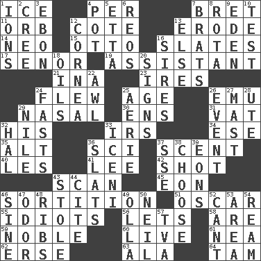 ACROSS 1. Frozen water 4. For each 7. Cy Young winner Saberhagen 11. Globe 12. ____ d'Azur (French Riviera) 13. Wear away 14. Modern: prefix 15. Von Bismarck 16. Chalkboards 17. Sir (Sp.) 19. Aide 21. _ tizzy (2 wds.) 23. Angers 24. Soared 25. Personal question 26. Australian flightless bird 29. Rhinal 30. Followers of ems 31. Large container 32. Part of HMS, perhaps 33. Big collection agency 34. Compass dir. 35. The first octave above the treble staff 36. _-fi 37. Aroma 40. French article 41. Area sheltered from the wind 42. Guess 43. Examine minutely or intensely 45. Period of immesurable duration 46. Decision 51. Motion picture award 55. Foolish or stupid persons 56. Allows 58. "We ___ not amused" (Victoria) 59. Impressive in appearance 60. Not recorded 61. Teachers' org. 62. Celtic language 63. Chicken ___ king 64. Scottish cap DOWN 1. Charged atoms 2. Algonquian 3. Inky black, to poets 4. Cooking vessel 5. Singer James 6. Vintage cars 7. Naughty children 8. Round or rotation of duties 9. Genesis locale 10. Trial 12. Pupil covering 13. Otherwise 16. Male parents of animals 18. Petroleums 20. Attaches a signature 22. Leather borer 24. Goes without food and/or water 25. Nest on high 26. Incident 27. Vertical spar for supporting sails 28. Shoshoni 29. The longest river in the world 32. Actor Linden 33. Ancient Celtic tribe of eastern Britain 36. Narrow boards 37. Compass dir. 38. Opt 39. Immeasurably long periods of time 43. Took without asking 44. Quote 46. Trig term 47. Aroma 48. Teases 49. Water jar 50. Famous astronaut Armstrong 52. Patter 53. Type of rug 54. 480, 500 or 516 sheets of paper 57. Federal power corp.