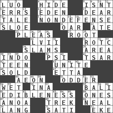ACROSS 1. Nilotic language 4. Flintstone garb 8. Is not 12. Blunders 14. Paradise 15. Letter starter 16. Falsehood 17. Unrelated to defense, as in spending 20. A type of plum 21. Boat paddle 22. Had dinner 23. Entreaties 27. Carrot, for example 29. 57 in ancient Rome 31. College mil. group 34. Hits or strikes with great force 35. Type of rug 36. _ china 39. 23rd letter of the Greek alphabet 41. Russian ruler of old 42. Adolescent 43. Join together 46. Disposed of to a purchaser 47. Singer James 48. A really long time 51. More peculiar 54. Dripping 56. _ tizzy (2 wds.) 58. Indonesian resort city 61. The property of being fit to eat 66. Singles 67. Small Philippine buffalo 68. Long journey 69. Be tempered by heat 70. Austrian-born American filmmaker Fritz 71. Suttee (variant) 72. Supplement with great effort DOWN 1. Allows 2. Mountain range 3. Lowest deck of a ship 4. Layer 5. Wedding promise 6. Lair 7. Inside; within (prefix) 8. Binary compound 9. Elected representatives 10. Political cartoonist Thomas 11. Family _ (genealogy) 13. Stitch closed the eyes of (a falcon) 18. Hearing organ 19. From 24. Pipe bend 25. Actress Gardner 26. Simple or foolish person 28. Speak pompously 30. Come out of 32. Beverage made from leaves 33. Auto 34. Message 36. It is 37. Modern: prefix 38. Conveyance 40. To the inside or interior of 44. It would 45. Small amount or degree 49. Petroleum 50. Compass dir. 52. Inky black, to poets 53. Indian princess (variant) 54. Welt 55. Pulitzer Prize-winning author Ferber 57. Pismires 59. Path through which fluid escapes 60. Small island 62. Paper or plastic container 63. Period 64. Arrange properly for use 65. What Jean-Claude Killy likes to do