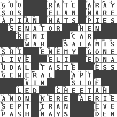 ACROSS 1. Thick or sticky substance 4. Pace 8. Like ___ of sunshine 12. Distress signal 13. Style 14. Female horse 15. Bee-related 18. Floor coverings 19. Sliced desserts 20. Legislator 22. Layer 23. Painter Guido (1575-1642) 24. Auto 25. Armed conflict 26. Deli grouping 30. _ Lanka 33. Foe 36. Went 37. Moving, as bait 39. Biblical high priest 40. Pulitzer Prize-winning author Ferber 41. Hereditary estate 42. Clothes sense 44. Double-curved letter 45. Commissioned military rank 47. Fitting 50. Zeal 51. _ gin 53. Directed 54. Leopard's kin 57. At once, immediately (arch.) 59. We are 61. Nest on high 63. Back-to-school mo. 64. SW Asia republic 65. Night before a holiday 66. Romantic infatuation 67. Negative votes 68. Lair DOWN 1. Girls' org. (abbr.) 2. I made a mistake 3. Flexible twig of a willow tree 4. San ____ (Riviera town) 5. Having or resembling wings 6. Make lace 7. Followers of ems 8. Electrical Measurement 9. Precipitation 10. "We ___ not amused" (Victoria) 11. Affirmative reply 16. Afresh 17. Grandmother 21. Hoop that covers a wheel 22. Actor Linden 24. Island 26. Stricken, poetically 27. Method 28. Lodging establishments 29. Oceans 30. Strike heavily 31. Travel on an animal 32. _ the terrible 34. Be tempered by heat 35. Raised railways 38. Veterans Day date 42. Scottish cap 43. Relaxation 46. To free from 48. Entreaty 49. Lug 52. Having ears or earlike features 53. Chops off 54. Supercomputer manufacturer 55. Coop moms 56. Hub of activity 57. Viper 58. Teachers' org. 59. Victory 60. Period 62. Car or cant ending
