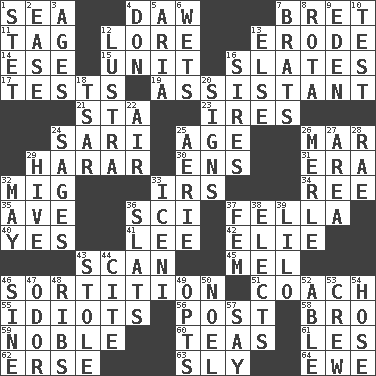 ACROSS 1. Ocean 4. Obsolete 7. Cy Young winner Saberhagen 11. Label 12. Old wives' tales, e.g. 13. Wear away 14. Compass dir. 15. A single undivided whole 16. Chalkboards 17. Trials 19. Helper 21. R.R. building 23. Angers 24. Indian skirt 25. Mature 26. Spoil 29. Ethiopian city, capital of Harari 30. Followers of ems 31. Epoch 32. Russian fighter aircraft 33. Big collection agency 34. Portuguese money of account (variant) 35. "___ Maria" 36. _-fi 37. Man or boy (slang) 40. Consenting reply 41. Area sheltered from the wind 42. Writer Wiesel 43. Examine minutely or intensely 45. Cartoonist voice _ Blanc 46. Making a chance decision by using lots 51. Team commander 55. Foolish or stupid persons 56. Mail 58. Sis' sibling 59. Having high moral qualities 60. Beverages made from leaves 61. French article 62. Celtic language 63. Secret 64. She-sheep DOWN 1. Proofreading order 2. Relaxation 3. Eons 4. Spanish title 5. Roberta Peters solo 6. Moistens 7. Naughty children 8. Roll call or roster of names 9. Locale of original sin 10. Trial 12. A period of five years 13. Otherwise 16. Fathers 18. Russian ruler of old 20. Omens 22. Atmosphere 24. Gurus 25. Nest on high 26. Haggard of country music 27. Type of rug 28. Actress Charlotte 29. Hub of activity 32. Can I? 33. Ancient Celtic tribe of eastern Britain 36. Narrow boards 37. Opposite of masc. 38. Chooses 39. _ and Stitch 43. Took without asking 44. Quote 46. Trig term 47. Scent 48. Chest bones 49. Chooses 50. Christmas carol 52. Competent 53. Group working together 54. Flexible conduit 57. Declare