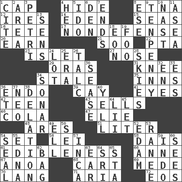 ACROSS 1. Head covering 4. Flintstone garb 8. Inactive volcano in Sicily 12. Angers 14. Locale of original sin 15. Oceans 16. Wig 17. Unrelated to defense, as in spending 20. Merit 21. "Barney Miller" actor Jack 22. Parent Teacher Assoc. 23. Small island 27. Characteristic smell of wine 29. Mouths or openings 31. Leg joint 34. Showing deterioration from age 35. Lodging establishments 36. Inside; within (prefix) 39. Island 41. Sight organs 42. Adolescent 43. Makes a sale 46. Root beer relative 47. Writer Wiesel 48. Ancient Greek god of war 51. 61 cubic inches 54. Put into a specified state 56. Flowery wreath 58. Raised platform 61. The property of being fit to eat 66. Queen of England 1702-14 67. Small Philippine buffalo 68. Draw slowly or heavily 69. Ancient Persian 70. Long (Scottish) 71. Operatic vocal solo 72. Greek goddess of the dawn DOWN 1. Quote 2. Type of rug 3. _ dish (used to culture cells) 4. Layer 5. Wedding promise 6. Lair 7. Conclusions 8. Compass dir. 9. 3-inch nail 10. Political cartoonist Thomas 11. Toward the sea 13. Elected reps. 18. Period of immesurable duration 19. Egg _ yung 24. Car dealer's back yard 25. Period 26. Baby powder 28. Atmospheres 30. Gospel singer Marvin 32. Compass dir. 33. Curvy letter 34. Underwater navigation system 36. And so on (abbr.) 37. Modern: prefix 38. Accusation by an informer 40. Shout 44. Cards in a Roman deck? 45. Allow 49. Pipe bend 50. Perceive with the eye 52. Dutch treat 53. Indian princess (variant) 54. Lick closed 55. Pulitzer Prize-winning author Ferber 57. South American Indian 59. Southeast Asian peninsula 60. Observes 62. Container for groceries 63. Ewer handle 64. Indian title of respect (Mr.) 65. R.R. building