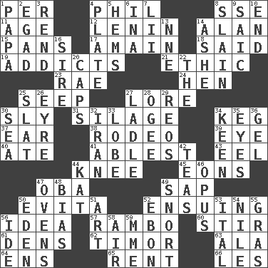 ACROSS 1. For each 4. Silvers or Donahue 8. Compass dir. 11. Personal question 12. Soviet premier 1918-24 14. Actor Alda or Thicke 15. Baking dishes 17. At full speed 18. Stated 19. Inveterate users 21. Value system 23. Actress Charlotte 24. Layer 25. Ooze 27. Old wives' tales, e.g. 30. Wily 31. Fodder prepared in a silo 34. Barrel 37. Hearing organ 38. Cowboy competition 39. Sight organ 40. Had dinner 41. Most capable 43. Snakelike fish 44. Leg joint 45. Immeasurably long periods of time 47. Chief or king in Benin or Nigeria 49. Plant excrement 50. Webber/Rice musical 52. Following as a consequence or result 56. It may be bright or harebrained 57. Role for Stallone 60. Move through with a circular motion 61. Cub Scout units 62. Southeast Indonesia island 63. Chicken ___ king 64. Followers of ems 65. Monthly bill 66. French article DOWN 1. Dad 2. Mild oath 3. Tear apart 4. Food holder 5. Folds over and sews together 6. _ tizzy (2 wds.) 7. Cards in a Roman deck? 8. Killed 9. Ketch in the Levant 10. Conclude 13. Compass dir. 14. American tennis player Robert 16. Male parent of an animal 20. Smile enhancers 22. Definite Article 25. Narrow board 26. Jane of fiction 27. Dipping utensil 28. Double curve, resembling the letter S 29. Vintage cars 30. Ocean 32. SW Asia republic 33. Ear part 34. Peachy ____! 35. Sight organs 36. Set 42. Beverages made from leaves 44. Krazy ___ of comics 46. Musical composition 47. Baking chambers 48. Prejudice 49. Derisive sound 50. Locale of original sin 51. Tate display 52. Inky black, to poets 53. Slanted text style (abbr.) 54. The longest river in the world 55. Pate de foie ____ 56. Binary compound 58. Atmosphere 59. Madame (abbr.)