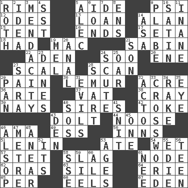 ACROSS 1. Basketball hoops 5. Helper 9. 23rd letter of the Greek alphabet 12. Lyric poems 13. Grant temporary use of 14. Actor Alda or Thicke 15. Portable shelter 16. Extremities 17. Bristle 18. Possessed 19. Big _ 21. Unit of acoustic absorption 22. Arabian gulf 24. "Barney Miller" actor Jack 26. Compass dir. 27. Any of the three canals of the cochlea 28. Examine minutely or intensely 29. Ache 30. Arboreal primate 32. 43,560 square feet 36. Johnson of "Laugh-In" 37. Large container 38. Supercomputer manufacturer 39. Negative votes 40. Titles for men of rank and authority 42. Puff or smoke 43. Dunce 44. Trap for birds or small mammals 46. Housemaid (var.) 49. Curvy letter 50. Restaurants 51. Soviet premier 1918-24 53. Had dinner 54. Soggy 57. Proofreading order 58. Volcanic refuse 61. Thickened enlargement 62. Mouths or openings 63. Drop; flow; fall 64. One of the Great Lakes 65. For each 66. Snakelike fish 67. Paradise DOWN 1. Writer of Portnoy's Complaint (1969) 2. It may be bright or harebrained 3. Ananias' fault 4. Fast jet (abbr.) 5. Actor Baldwin 6. Electrically charged atom 7. Male parent 8. Followers of ems 9. Military trainee 10. Smooth fabric 11. Silly 14. White ___ sheet 19. Cartoonist voice _ Blanc 20. Of or related to the anus 21. Manchild 23. Natives or inhabitants of Denmark 24. Snake scale 25. Boat paddle 27. "Two Mules for Sister ____" 28. Don Adams' spy role 29. Baking dish 31. Vices 32. 13-14th century defensive garment 33. What you're doing now 34. Immoral or dissolute person 35. Sight organ 40. Mayday 41. In a ____ (agitated or irritated) 43. Lair 45. Single 46. Columnist Joseph or Stewart 47. Distance measurement (Brit.) 48. Approach 52. It is 53. Grows older 55. Singer Brickell 56. Adolescent 58. Compass dir. 59. Untruth 60. Everything 61. Born