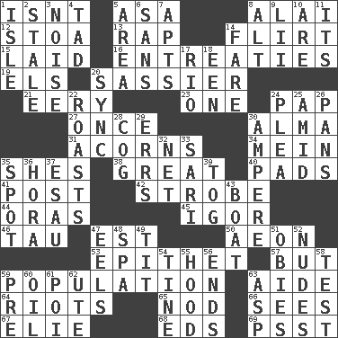 ACROSS 1. Is not 5. White ___ sheet 8. Jai _ 12. Portico 13. Hit sharply and swiftly 14. Talk or behave amorously 15. Put down 16. Pleas 19. Raised railways 20. More lively and spirited 21. Suggestive of the supernatural 23. Single 24. Infant food 27. At one time in the past 30. _ mater 31. Oak nuts 34. Count _ (2 wds.) 35. "______ My Girl" (Turtles hit) 38. Relatively large 40. Writing tablets 41. Mail 42. Disco prop 44. Mouths or openings 45. Composer Stravinsky 46. The 19th letter of the Greek alphabet 47. Eastern Standard Time (abbr.) 50. A really long time 53. Curse 57. Yet 59. Census information 63. Helper 64. Debaucheries 65. Lower and raise head in agreement 66. Observes 67. Writer Wiesel 68. Begley and Asner 69. Inconspicuous attention getter DOWN 1. Capri or Wight 2. Showing deterioration from age 3. Annoying sound 4. Small boy 5. Type of rug 6. Without 7. Tenement units (abbr.) 8. Keyboard modifier key 9. Cards in a Roman deck? 10. "We ___ not amused" (Victoria) 11. It is 14. Conductor's collection 17. _ de Janeiro 18. Car or cant ending 20. Synchronize (abbr.) 22. Exposes to great heat 24. Entreaty 25. Among 26. Baking dishes 28. Gear tooth 29. Blunders 30. Electrical Unit 32. Remaining after all deductions 33. Indian skirt 35. Specific locale 36. Israeli folk dance 37. Son of Isaac 39. Coat; cloak 43. Water vessel 47. Snakelike fish 48. Health resort 49. Teat (slang) 51. Off-Broadway awards 52. Unadorned figures 54. Prong on a fork 55. Parka part 56. Conclusions 58. Trial 59. Before (prefix) 60. Petroleum 61. Luau course 62. Shoshoni 63. Viper