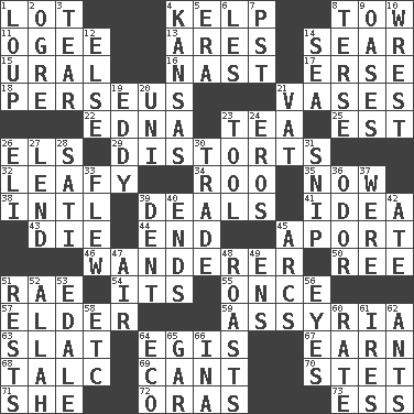 ACROSS 1. Car dealer's back yard 4. Seaweed 8. Pull behind 11. Double curve, resembling the letter S 13. Ancient Greek god of war 14. Dry up 15. Mountain range 16. Political cartoonist Thomas 17. Celtic language 18. Son of Zeus who helped slay Medusa 21. Flower holders 22. Pulitzer Prize-winning author Ferber 23. Afternoon social gathering 25. Eastern Standard Time (abbr.) 26. Raised railways 29. What propaganda does 32. Like summer trees 34. Friend of Pooh 35. Immediately 38. International (abbr.) 39. Allots cards 41. It may be bright or harebrained 43. Pass on 44. Conclude 45. To the left, to Queeg 46. Nomad 50. To separate or throw off 51. Actress Charlotte 54. It is 55. Single time 57. A person who is older than you are 59. Nineveh was its capital 63. Narrow board 64. The front part of a cuirass 67. Merit 68. Baby powder 69. Patter 70. Proofreading order 71. A female animal or person 72. Mouths or openings 73. Curvy letter DOWN 1. Central Nebraska county 2. Legendary monster 3. Pull into pieces 4. Sunflower state 5. Period 6. French article 7. Pacific Standard Time (abbr.) 8. Laconic 9. Fertile tracts in a desert 10. Take or capture by force 12. Otherwise 14. Ocean 19. Whirlpool 20. Corn or form start 21. Large container 23. Instrument 24. Greek god of love 26. Biblical high priest 27. Grant temporary use of 28. Suttee (variant) 30. Buy and sell 31. Clip 33. Soared 36. Scent 37. We are 39. Gouge 40. Conclusions 42. Had dinner 45. Arches 47. Wind 48. Exposes to great heat 49. Followers of ems 51. Musical pauses 52. Assad's deity 53. Peak District village in England 56. Sight organs 58. And so on (abbr.) 60. Assign a rank or rating to 61. Angers 62. Pismires 64. Environmental prefix 65. Slender fish 66. _ tizzy (2 wds.)