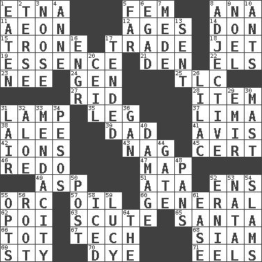 ACROSS 1. Inactive volcano in Sicily 5. Opposite of masc. 8. Santa ___, CA 11. A really long time 12. Eons 14. Spanish title 15. Marketplace scale 17. Buy and sell 18. _ stream 19. Substance 21. Lair 22. Raised railways 23. Born 24. Commissioned military rank (abbr.) 25. Affectionate concern, for short 27. To free from 28. Detail 31. Desk light 35. Part of a journey 37. Pale green bean 38. Toward shelter 39. June honoree 41. Opinion 42. Charged particles 43. Tired old horse 45. Foregone conclusion 46. Redecorate 47. Atlas unit 49. Viper 51. "One Day ___ Time" 52. Followers of ems 55. The grampus (Milton) 57. Petroleum 60. Commissioned military rank 62. Luau course 63. Snake scale 65. Before Barbara or Clara 66. Small child 67. Georgia ____ (Atlanta school) 68. Thailand, formerly 69. Filthy place 70. Color 71. Snakelike fish DOWN 1. Consumed 2. Laconic 3. Trap for birds or small mammals 4. Singer Murray 5. At a great distance 6. Mild oath 7. Ancient Persian 8. Descriptive word 9. Christmas carol 10. Pismires 13. Transmitted 16. Engineer (abbr.) 17. Watched over 20. To provide with a ceiling 26. Pale purple color 29. Arab leader 30. Vertical spar for supporting sails 31. Den 32. _ vera 33. Ananias' fault 34. Mexican monetary units 36. Separate the seeds from cotton 40. Break 44. Yard entry 48. Zero-star reviews 50. Mail 52. Bert's buddy 53. Brizilian seaport 54. Hits or strikes with great force 55. Chooses 56. Carrot, for example 58. On the rocks 59. "I Love _" 61. Relaxation 64. Definite Article