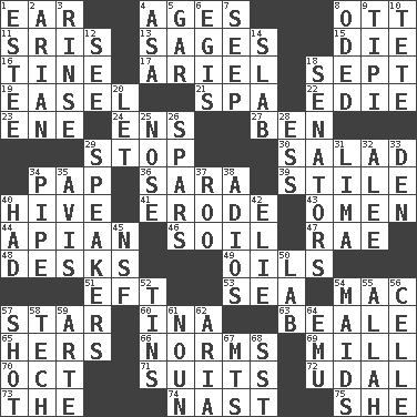 ACROSS 1. Hearing organ 4. Eons 8. Baseball player Mel 11. Indian titles of respect 13. Gurus 15. Expire 16. Prong on a fork 17. Satellite of Uranus 18. Back-to-school mo. 19. Artist's stand 21. Health resort 22. Singer Brickell 23. Compass dir. 24. Followers of ems 27. Benjamin's nick name 29. Discontinue 30. Vegetable dish 34. Infant food 36. "Two Mules for Sister ____" 39. Vertical member of a panel or frame 40. Hub of activity 41. Eat (away) 43. Sign of things to come 44. Bee-related 46. Land 47. Actress Charlotte 48. Writing tables 49. Petroleums 51. Lizard (obsolete) 53. Ocean 54. Big _ 57. Play the lead 60. _ tizzy (2 wds.) 63. Calif. Air Force Base 65. Possessive pronoun 66. Typical standards 69. Place where flour is made 70. Sep. follower 71. Costumes for special activities 72. Freehold land 73. Definite Article 74. Political cartoonist Thomas 75. A female animal or person DOWN 1. First name in cosmetics 2. Believer in; advocate of (suffix) 3. Wash lightly 4. White ___ sheet 5. Slender fish 6. Armor plate that protects the chest 7. Ooze 8. Wrote a lyric poem 9. Native american tent (variation) 10. Wig 12. Perceive with the eye 14. Thick slice 18. Legislators 20. Allow 25. Olfactory organ 26. Practice fights 28. Double-curved letter 29. Orators 31. Pale green bean 32. Toward shelter 33. Lair 34. Corncob 35. Opinion 37. Friend of Pooh 38. Goodbye (Sp.) 40. Possessed 42. Writer Wiesel 45. Overdraft (abbr.) 50. Experiment locale 52. Airtight sealed metal containers 54. Unmarried girls 55. Assad's deity 56. Cell (Danish) 57. Went for two points 58. Technician 59. Johnson of "Laugh-In" 61. Part of speech 62. Operatic vocal solo 64. Australian flightless bird 67. Mountains (abbr.) 68. Fast jet (abbr.)