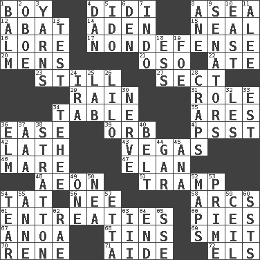 ACROSS 1. Male child 4. "You Light Up My Life" star Conn 8. At sea 12. Blind as ____ 14. Arabian gulf 15. Be tempered by heat 16. Old wives' tales, e.g. 17. Unrelated to defense, as in spending 20. Not women's 21. Bear (Spanish) 22. Had dinner 23. Not moving 27. Religious group 29. Precipitation 31. Hero or heavy, e.g. 34. Eating place 35. Ancient Greek god of war 36. Comfort 39. Globe 41. Inconspicuous attention getter 42. Thin strip of wood or metal 43. Viva Las _ 46. Female horse 47. Enthusiasm 48. A really long time 51. _____ steamer (cargo ship) 54. Make lace 56. Born 58. Curves 61. Pleas 66. Sliced desserts 67. Small Philippine buffalo 68. Metal containers 69. Stricken, poetically 70. French philosopher Descartes 71. Assistant 72. Raised railways DOWN 1. Lip ointment 2. Mitch Miller's instrument 3. Tall tales 4. Daniel's nick name 5. Wedding promise 6. Lair 7. _ china 8. A saturated hydrocarbon 9. Elected representatives 10. 90 degrees 11. Toward shelter 13. Trial 18. Double-curved letter 19. Enemy 24. Retirement account (abbr.) 25. Experiment locale 26. _ and Stitch 28. Dice game 30. Impudent aggressiveness 32. French article 33. Eastern Standard Time (abbr.) 34. Giggle 36. Shade tree 37. American Automobile Association (abbr.) 38. Ski resort town in Vermont 40. Waist strap 44. Slender fish 45. Santa ___, CA 49. Single 50. Teachers' org. 52. Atlas contents 53. A-one 54. Rend 55. Singer Murray 57. Singer James 59. To provide with a ceiling 60. Fast planes 62. Actress Charlotte 63. One more than two 64. Conclusion 65. Compass dir.