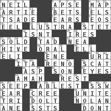 ACROSS 1. Famous astronaut Armstrong 5. Domed church section 9. Atlas unit 12. Nick name for Arthur 14. Stakes 15. Raised railways 16. Sadhe (variant) 17. Hearing organs 18. Greek goddess of the dawn 19. Snakelike fish 20. A period of five years 23. Proofreading order 24. Is not 25. Angers 27. Disposed of to a purchaser 30. Small boy 32. Teachers' org. 33. Hub of activity 34. Relating to the mouth 36. Pipe bend 38. Biblical high priest 39. Compass dir. 40. RI univ. 43. Call ___ day 46. Western Nevada city 48. Go away! 49. Cleo's killer 51. Male offspring 52. Sight organs 53. Wet nurse 54. State of inaction 56. Ooze 58. Most capable 61. Compass dir. 64. Ewer handle 65. Algonquian 66. Join together 68. Three (prefix) 69. Stupid person 70. Pitcher Ryan 71. A saturated hydrocarbon 72. Fast planes 73. Do not DOWN 1. Nathan's nickname 2. Celtic language 3. Slanted text style (abbr.) 4. Hat (slang) 5. Collude with 6. Lightbulb-shaped fruit 7. Put through a sieve 8. Double-curved letter 9. Confronts 10. _ vera 11. Inconspicuous attention getter 13. Snakelike fish 21. To (old English) 22. A viewer who gazes fixedly 23. Lick closed 24. Binary compound 26. To separate or throw off 27. A female animal or person 28. Lubricate 29. 57 in ancient Rome 31. Natives or inhabitants of Denmark 35. Poe poem 37. "I Love _" 41. Actress Charlotte 42. ___ a Wonderful Life 44. Pack (down) 45. White ___ sheet 47. Washington bills 48. Arrange properly for use 50. N Egypt peninsula 53. Nest on high 55. Astound 56. Bristle 57. Merit 59. Waist strap 60. Allows 61. Grain storage tower 62. Comedian Laurel of Laurel & Hardy 63. Gone 65. Music discs 67. Lower and raise head in agreement