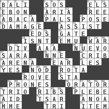 ACROSS 1. Indonesian resort city 5. Distress signal 8. Raised railways 11. Inky black, to poets 12. Roberta Peters solo 14. To riddle 15. Phillipine bananalike plant 17. Friends 18. Airs 19. Break 21. Help 23. Begley and Asner 25. Yard entry 26. Is not 27. Australian flightless bird 28. Armed conflict 31. HTML Container Element 33. Auto club (abbr.) 35. New (sp.) 37. "Two Mules for Sister ____" 38. Compass dir. 40. Baby bed with high sides 41. Sports stadium 43. Hearing organ 45. French article 46. Affirmative reply 47. Lower and raise head in agreement 50. Round or rotation of duties 52. Be footloose 53. R.R. building 54. Gives a jingle 56. Speaker 61. Musical group of three 62. Chest bones 65. Cadet 66. Assist 67. Russian ruler of old 68. Small Philippine buffalo 69. Madame (abbr.) 70. Three (prefix) 71. A whole individual unit DOWN 1. Necklace unit 2. Swedish rock group 3. Rich soil 4. South American Indian 5. Plant excrement 6. Mouth or opening 7. Fodder prepared in a silo 8. Greek god of love 9. For fear that 10. Observe 13. Indian state 16. Matures 18. Sliced dessert 20. Pulitzer Prize-winning author Ferber 22. Astound 24. Comedian Laurel of Laurel & Hardy 26. _ the terrible 28. We are 29. Deliberation 30. Director Reiner 31. Have the gumption 32. Angers 34. A saturated hydrocarbon 36. Southern CA. univ. 37. Declare 39. Hearing organs 42. At once, immediately (arch.) 44. Printing process, for short 48. Unconcealed 49. Cease 51. Canvas cover 52. Friend of Pooh 54. Demure 55. Flintstone garb 57. Jai _ 58. Portable shelter 59. Mitch Miller's instrument 60. 480, 500 or 516 sheets of paper 61. Scottish cap 63. Soap unit 64. _ Lanka