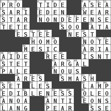 ACROSS 1. Adept person 4. Periodic rise and fall of the sea level 8. Toward the sea 12. Indian skirt 14. Paradise 15. Erode 16. Play the lead 17. Unrelated to defense, as in spending 20. Wig 21. "Barney Miller" actor Jack 22. _ moment's notice (2 wds.) 23. First name in cosmetics 27. A home for chicks 29. Like (prefix) 31. Musical sound 34. Mesonic 35. Operatic vocal solo 36. Assistant 39. Portuguese money of account (variant) 41. Is not 42. Proofreading order 43. Therefore, facetiously 46. Diluted with white 47. Common sense 48. Ancient Greek god of war 51. Box-office sellout 54. Put into a specified state 56. French article 58. Desk light 61. The property of being fit to eat 66. Margarine 67. Small Philippine buffalo 68. Opposed to 69. Immeasurably long periods of time 70. Austrian-born American filmmaker Fritz 71. Lightbulb-shaped fruit 72. Compass dir. DOWN 1. Inconspicuous attention getter 2. Pace 3. Speak pompously 4. Nine, plus one 5. Wedding promise 6. Lair 7. Extremities 8. Deep reverence 9. Legislators 10. Compass direction 11. Type of rug 13. Angers 18. A really long time 19. Enemy 24. Definite Article 25. Greek goddess of the dawn 26. Independent ruler or chieftain 28. Slow-paced one 30. Sea 32. Metal container 33. Ingest 34. Distance measurement 36. Cleo's killer 37. Call ___ day 38. Conveyance 40. Greek god of love 44. Chewing product 45. White ___ sheet 49. Pipe bend 50. Observe 52. A type of plum 53. Auras 54. Lick closed 55. Pulitzer Prize-winning author Ferber 57. Fastener 59. Not women's 60. Introduce or present, as a question 62. Container for groceries 63. Compass dir. 64. R.R. building 65. Title for a knight