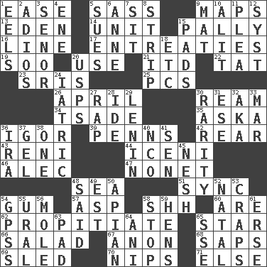 ACROSS 1. Comfort 5. Backtalk 9. Atlas contents 13. Genesis locale 14. A single undivided whole 15. Chummy 16. Actor's bit 17. Pleas 19. "Barney Miller" actor Jack 20. Purpose 21. It would 22. Make lace 23. Indian titles of respect 25. Personal Computers (abbr.) 26. Showery time 30. 480, 500 or 516 sheets of paper 34. Sadhe (variant) 35. "____ silly question..." 36. Russian composer Stravinsky 39. Actor Sean's family 42. Located in or toward the back 43. Painter Guido (1575-1642) 44. Ancient Celtic tribe of eastern Britain 46. Actor Baldwin 47. Music written for nine 48. Ocean 51. Synchronize (abbr.) 54. Chewing product 57. Cleo's killer 58. Quiet! 60. "We ___ not amused" (Victoria) 62. Appease 65. Play the lead 66. First course 67. Soon (poet.) 68. Plant excrements 69. Downhill vehicle 70. Pinches, bites 71. Otherwise DOWN 1. Snakelike fish 2. Goodbye (Sp.) 3. Sir (Sp.) 4. Compass dir. 5. Takes to court 6. Queen of England 1702-14 7. Be seated 8. Empty completely 9. Floor covering 10. Came down and settled, as after flight 11. Entreaty 12. System (abbr.) 15. Groovy apts. 18. And so on (abbr.) 20. United States Postal Service (abbr.) 24. Of or pertaining to medicine 27. Reproach for some lapse or misdeed 28. Binary compound 29. Soviet premier 1918-24 30. Noteworthy scarcity 31. Compass dir. 32. Alias (abbr.) 33. Spoil 36. Retirement account (abbr.) 37. Set 38. Single 40. Non-commissioned officer (abbr.) 41. Elected rep. 45. Delicate 48. Alleged 49. Eastern Standard Time (abbr.) 50. Bee-related 52. Relating to or accompanying birth 53. Dice game 54. Global Positioning Systems (abbr.) 55. Mountain range 56. Undercover agent 58. Discontinue 59. Coop moms 61. Celtic language 63. Groovy apt. 64. Cuckoo 65. Compass dir.