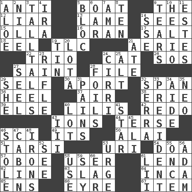 ACROSS 1. Against 5. Water vessel 9. Definite Article 12. One who doesn't tell the truth 13. Unable to walk 14. Perceives with the eye 15. Rounded earthenware pot or jar 16. Northwest Algerian city 17. Table seasoning 18. Snakelike fish 19. Affectionate concern, for short 21. Nest on high 22. Musical group of three 24. Feline 26. Mayday 27. Inhabitant of Heaven 28. Do some clerical work 29. Automatic 30. To the left, to Queeg 32. Connect, as a bridge 36. Person who is morally reprehensible 37. Wind 38. One of the Great Lakes 39. Otherwise 40. Ms. Damita and namesakes 42. Do over again 43. Charged atoms 44. Laconic 46. _-fi 49. ___ a Wonderful Life 50. Jai ____ 51. Tarsus (plural) 53. RI univ. 54. ___ good deed 57. Mitch Miller's instrument 58. One who uses or employs something 61. Grant temporary use of 62. Actor's bit 63. Volcanic refuse 64. South American Indian 65. Followers of ems 66. Jane of fiction 67. A distinct part DOWN 1. Medicinal plant 2. Mediterranean tributary 3. Baron Munchausen's specialties 4. Lyricist Gershwin 5. Alliance 6. Boat paddle 7. Nursemaid (var.) 8. "___ Little Indians" 9. Lacerates 10. Sun: prefix 11. _____ Park, CO 14. Compass dir. 19. Metal container 20. Globular water bottle used in Asia 21. Had dinner 23. Ransack; plunder; pillage 24. High-altitude cloud 25. The first octave above the treble staff 27. Sew up the eyelids of hawks and falcons 28. Fencing necessities 29. A female animal or person 31. Aches 32. Spanish missionary in California 33. Elected leader of a country 34. Assistant 35. Modern: prefix 40. Car dealer's back yard 41. Play the lead 43. One more than two 45. Connecticut Ivy Leaguer 46. Took without asking 47. Apartment or room in a ship 48. Metal shackles 52. Observe 53. Goad 55. Single time 56. First man 58. Purpose 59. Secret 60. Ewer handle 61. Cards in a Roman deck?