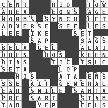 ACROSS 1. Penny 5. _ de Janeiro 8. Pull behind 11. Type of rug 12. Immeasurably long periods of time 14. Personal question 15. Typical standards 17. Synchronize (abbr.) 18. Allow 19. Contrary to your interests or welfare 21. Perceive with the eye 22. French article 23. Area sheltered from the wind 24. Mamie's husband 25. Put into a specified state 27. Plant excrement 28. Sinks 31. Actor Lugosi 35. Set 37. Mountain range southwest of Kyrgyzstan 38. Lyric poems 39. Two (Sp.) 41. Peachy ____! 42. Prejudice 43. Nervous spasm 45. Small island 46. Stalk of a moss capsule 47. Chop off 49. Part of HMS, perhaps 51. "One Day ___ Time" 52. Followers of ems 55. Compass dir. 57. Small island 60. Commissioned military rank 62. Ewer handle 63. Grin 65. Before Barbara or Clara 66. Before (prefix) 67. Indian skirt 68. Thailand, formerly 69. Bit 70. Slangy assent 71. Snakelike fish DOWN 1. Lessep's creation 2. Wear away 3. Boldness 4. Not wild 5. Marina Del _, California 6. Charged atoms 7. At one time in the past 8. Baron Munchausen's specialties 9. Double curve, resembling the letter S 10. Moistens 13. "______ My Girl" (Turtles hit) 16. Indian titles of respect 17. Oozed 20. Heroin 26. 1973 Nobel Price Winner (Physics) Leo 29. Highlander 30. Trig term 31. Moves up and down 32. Singer Brickell 33. Tough but pliablecoriaceous 34. Slender Brazilian palm 36. Car dealer's back yard 40. Fodder prepared in a silo 44. ____ d'Azur (French Riviera) 48. Zero-star reviews 50. Backtalk 52. Bert's buddy 53. Relating to or accompanying birth 54. Shuts with force 55. Back-to-school mo. 56. "Two Mules for Sister ____" 58. "If ____ say so..." 59. Hoop that covers a wheel 61. Comfort 64. Mouth edge
