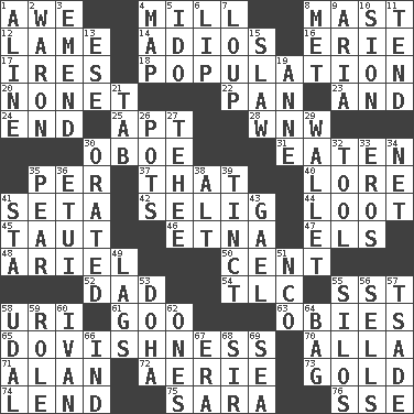 ACROSS 1. Deep reverence 4. Place where flour is made 8. Vertical spar for supporting sails 12. Unable to walk 14. Goodbye (Sp.) 16. One of the Great Lakes 17. Angers 18. Census information 20. Music written for nine 22. Baking dish 23. Also 24. Conclude 25. Fitting 28. Compass dir. 30. Mitch Miller's instrument 31. Ingested 35. For each 37. Not this but _ 40. Old wives' tales, e.g. 41. Stalk of a moss capsule 42. Major League Baseball Commissioner Bud 44. Plunder 45. Drawn tight 46. Inactive volcano in Sicily 47. Raised railways 48. Satellite of Uranus 50. Penny 52. Male parent 54. Affectionate concern, for short 55. Fast jet (abbr.) 58. RI univ. 61. Thick or sticky substance 63. Off-Broadway awards 65. Innocence, gentleness, or tenderness 70. Silent film actress Nazimova 71. Actor Alda or Thicke 72. Nest on high 73. Gilded 74. Grant temporary use of 75. "Two Mules for Sister ____" 76. Compass dir. DOWN 1. Place in a line 2. Make _____ (do battle with) 3. Make improvements or corrections to 4. Atlas unit 5. Wedding promise 6. Mouth edge 7. Central Nebraska county 8. Was introduced to 9. Roberta Peters solo 10. The Jewish people; Israel 11. Look after 13. Compass dir. 15. Cole _ (cabbage dish) 19. Singer Murray 21. Keyboard key 26. Plant holders 27. Giggle 29. Place for singles 30. Declaimed 32. Implement 33. Greek god of love 34. Fish or hair follower 35. Lightbulb-shaped fruit 36. Needle holder 38. The first octave above the treble staff 39. A color or tint 41. R.R. building 43. Highlander 49. Straggles 51. Non-commissioned officer (abbr.) 53. Capital of the state of Qatar 55. Grain storage towers 56. Makes a sale 57. Sadhe (variant) 58. Hereditary estate 59. Hero or heavy, e.g. 60. _ the terrible 62. Singles 64. Container for groceries 66. Working for oneself (abbr.) 67. Period 68. Title for a knight 69. Ocean