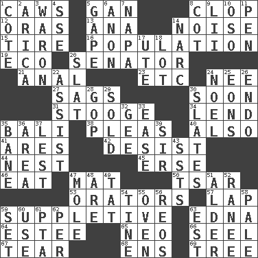 ACROSS 1. Crow sounds 5. Separate the seeds from cotton 8. Hoof sound 12. Mouths or openings 13. Santa ___, CA 14. Annoying sound 15. Hoop that covers a wheel 16. Census information 19. Environmental prefix 20. Legislator 21. Of or related to the anus 23. And so on (abbr.) 24. Born 27. Droops 30. Within a short period 31. Moe Howard, for one 34. Grant temporary use of 35. Indonesian resort city 38. Entreaties 40. In addition 41. Ancient Greek god of war 42. Stop 44. A home for chicks 45. Celtic language 46. Ingest 47. Floor covering 50. Russian ruler of old 53. Speakers 57. Pet locale 59. Supplementary 63. Pulitzer Prize-winning author Ferber 64. First name in cosmetics 65. Modern: prefix 66. Sew up the eyelids of hawks and falcons 67. Pull into pieces 68. Followers of ems 69. Relationship diagram DOWN 1. ____ d'Azur (French Riviera) 2. N. Chile seaport 3. Make _____ (do battle with) 4. Compass dir. 5. Stare wonderingly 6. At once, immediately (arch.) 7. California wine valley 8. Small bed 9. Cards in a Roman deck? 10. Bear (Spanish) 11. Animal enclosure 14. Drug cop 17. Shoshoni 18. Car dealer's back yard 20. Narrow board 22. Aid 24. Christmas carol 25. Immeasurably long periods of time 26. Inside; within (prefix) 28. Republican Party 29. Disposed of to a purchaser 30. Chalkboards 32. Turn to the right 33. Relaxation 35. Object of repulsion 36. Type of rug 37. For fear that 39. Title for a knight 43. Fast planes 47. Undercover agent 48. "We ___ not amused" (Victoria) 49. Make lace 51. Tree or shrub in the Birch family 52. The wife of a rajah (variant) 54. Prong on a fork 55. Baking chamber 56. Vintage cars 58. Diluted with white 59. Put into a specified state 60. Purpose 61. Parent Teacher Assoc. 62. For each 63. Eastern Standard Time (abbr.)
