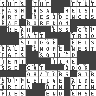 ACROSS 1. "______ My Girl" (Turtles hit) 5. Third day of the wk. 8. Needle case 12. Romantic infatuation 13. White ___ sheet 14. Robbery 15. Johnson of "Laugh-In" 16. Homes 19. Actress Charlotte 20. Mood resulting from idleness 21. Hitchcock's "____ Window" 23. Curvy letter 24. Police officer (slang) 27. Suttee (variant) 30. Musical group of three 31. Moe Howard, for one 34. Snakelike fish 35. Indonesian resort city 38. Dwarf 40. A home for chicks 41. The front part of a cuirass 42. Dirtied 44. Portable shelter 45. Become fatigued 46. Compass dir. 47. Feline 50. Scent 53. Speakers 57. Title for a knight 59. Supplementary 63. Helper 64. N. Chile seaport 65. Lair 66. Adolescent 67. Sliced desserts 68. Conclusion 69. Celtic language DOWN 1. Coast Guard woman 2. Ethiopian city, capital of Harari 3. First name in cosmetics 4. A female animal or person 5. Pacific island yam 6. One who uses or employs something 7. Relaxation 8. Car or cant ending 9. Nervous spasm 10. Purpose 11. It is 14. Equivocates 17. Binary compound 18. Two (Sp.) 20. Naughty child 22. Help 24. Algonquian 25. Petroleums 26. Mail 28. Coat; cloak 29. Charged atoms 30. Looked after 32. Thick or sticky substance 33. Give off 35. Stakes 36. Eras 37. Actor's bit 39. Connecticut Ivy Leaguer 43. Greek god of love 47. Root beer relative 48. "We ___ not amused" (Victoria) 49. Make lace 51. Flexible twig of a willow tree 52. Amusement-park features 54. Periodic rise and fall of the sea level 55. Baking chamber 56. Tear apart 58. French philosopher Descartes 59. Plant excrement 60. RI univ. 61. Sliced dessert 62. Personal Computers (abbr.) 63. Had dinner