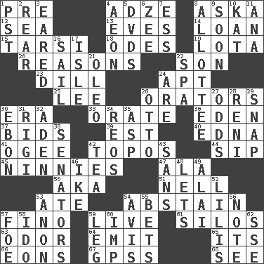 ACROSS 1. Before (prefix) 4. Edge tool used to cut and shape wood 8. "____ silly question..." 12. Ocean 13. Nights before holidays 14. Grant temporary use of 15. Tarsus (plural) 18. Lyric poems 19. Globular water bottle used in Asia 20. Thinks logically 22. Male child 23. Deli pickle 24. Fitting 25. Area sheltered from the wind 26. Speakers 30. Epoch 33. Speak pompously 36. Genesis locale 37. Auction offers 39. Eastern Standard Time (abbr.) 40. Pulitzer Prize-winning author Ferber 41. Double curve, resembling the letter S 42. Literary convention 44. Small drink 45. Fools 47. According to 50. Alias (abbr.) 51. 1994 drama film starring Jodie Foster 53. Had dinner 54. Refrain by choice 57. Fine (Spanish) 59. Not recorded 61. Grain storage towers 63. Aroma 64. Give off 65. It is 66. Immeasurably long periods of time 67. Global Positioning Systems (abbr.) 68. Observe DOWN 1. Pacific Standard Time (abbr.) 2. Hitchcock's "____ Window" 3. Having ears or earlike features 4. A really long time 5. Movie discs 6. Last letter of the English alphabet 7. Curvy letter 8. One to whom something is allotted 9. Within a short period 10. Krazy ___ of comics 11. Santa ___, CA 16. Move on water 17. Capri or Wight 21. Butter sub 22. Health resort 24. "We ___ not amused" (Victoria) 26. Von Bismarck 27. Likelihood 28. Painter Guido (1575-1642) 29. Fastener 30. Inky black, to poets 31. Swiss mountan, "Queen of the Mountains" 32. Arabian gulf 34. Vintage cars 35. Viper 38. Legislators 42. Beverage made from leaves 43. Without 46. Mamie's mate 48. Allows 49. Jai ____ 52. Ms. Damita and namesakes 53. At once, immediately (arch.) 54. Deliberation 55. Stakes 56. Short letter 57. Enemy 58. Wedding promise 59. Part of a journey 60. Naughty child 62. Compass dir.