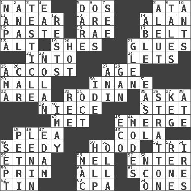 ACROSS 1. Nathan's nickname 5. Two (Sp.) 8. "One Day ___ Time" 11. Approach 13. "We ___ not amused" (Victoria) 14. Actor Alda or Thicke 15. Thick mixture 16. Actress Charlotte 17. Waist strap 18. Keyboard modifier key 19. "______ My Girl" (Turtles hit) 21. Cements 22. To the inside or interior of 24. Allows 25. Buttonhole 27. Personal question 29. Shopping center 30. Silly 32. Type of rug 33. "The Thinker" sculptor 35. "____ silly question..." 39. Sibling's daughter 41. Proofreading order 42. Was introduced to 43. Develop 45. Entreaty 48. Root beer relative 49. Morally degraded 50. Parka part 52. Three (prefix) 55. Inactive volcano in Sicily 56. Cartoonist voice _ Blanc 57. Keyboard key 59. Demure 60. Everything 61. Biscuitlike quick bread 62. Metal container 63. Numbers guy (abbr.) 64. Singles DOWN 1. California wine valley 2. Of or related to the anus 3. A testis 4. Ingest 5. Have the gumption 6. Mouths or openings 7. Observe 8. Native American of Southwest Alaska 9. Stories 10. Pismires 12. Musical pauses 14. Competent 20. Being at a high temperature 21. Small, secluded valley 23. Pitcher Ryan 25. Housemaid (var.) 26. Automobile 27. Cuckoo 28. Separate the seeds from cotton 30. Binary compound 31. Artist's stand 33. To sift 34. Sep. follower 36. Ski resort town in Vermont 37. Cask 38. Had dinner 40. "If ____ say so..." 43. Environmental prefix 44. Methods 45. _ dish (used to culture cells) 46. Soviet premier 1918-24 47. Dutch treat 49. Back-to-school mo. 50. Aid 51. Water jar 53. French philosopher Descartes 54. Angers 56. Apple computer (short form) 58. Non-commissioned officer (abbr.)