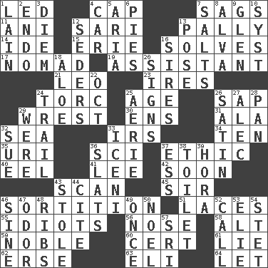 ACROSS 1. Directed 4. Head covering 7. Settles 11. Black tropical American cuckoo 12. Indian skirt 13. Friendly 14. Binary compound 15. One of the Great Lakes 16. Finds the solution 17. Roamer 19. Aide 21. Lion 23. Angers 24. Torque (variant) 25. Mature 26. Plant excrement 29. Obtain by seizing forcibly or violently 30. Followers of ems 31. In the manner of 32. Ocean 33. Big collection agency 34. Nine, plus one 35. RI univ. 36. _-fi 37. Moral principle 40. Snakelike fish 41. Area sheltered from the wind 42. Within a short period 43. Skim 45. Title for a knight 46. Casting lots 51. Shoestrings 55. Foolish or stupid persons 56. Characteristic smell of wine 58. Keyboard modifier key 59. Having high moral qualities 60. An absolute certainty 61. Falsehood 62. Celtic language 63. Biblical high priest 64. Allow DOWN 1. (Had) reclined 2. Inside; within (prefix) 3. South Vietnam president (1954) 4. Automobile 5. Roberta Peters solo 6. Sliced desserts 7. Table seasonings 8. Inventor's middle name 9. Small, secluded valley 10. System (abbr.) 12. Spring feasts 13. Airs 16. Founders of families 18. Medicinal plant 20. Public displays of written messages 22. Sep. follower 24. Hang back 25. Nest on high 26. Smooth fabric 27. Actor Baldwin 28. Baking dish 29. Past tense of be (plural) 32. Institute legal proceedings 33. Ancient Celtic tribe of eastern Britain 36. Narrow boards 37. Double-curved letter 38. Bathroom 39. Israeli folk dance 43. Fur scarf 44. Quote 46. Trig term 47. Aroma 48. Teases 49. At one time in the past 50. Christmas carol 52. Give a ring to 53. Writer Wiesel 54. Proofreading order 57. Indian title of respect (Mr.)