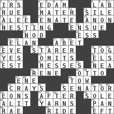 ACROSS 1. Big collection agency 4. Dutch treat 8. Experiment locale 11. Sorrow 12. Mother 14. Filth; sediment 15. Toward shelter 17. Related on the mother's side 18. At once, immediately (arch.) 19. Nestling 21. Take place subsequently 23. Allow head to fall sleepily 24. Curvy letter 25. Style 27. Collude with 30. First lady 31. A viewer who gazes fixedly 34. Coat; cloak 37. Affirmative reply 38. Leaves out 39. Raised railways 40. Eastern Standard Time (abbr.) 41. Makes clutter 43. Teachers' org. 44. French philosopher Descartes 45. "Beetle Bailey" pooch 47. Compass dir. 49. Pull behind 50. Trading vessels 52. Legislator 56. Immeasurably long periods of time 57. Following 60. Not divided or shared with others 61. Came down and settled, as after flight 62. Entertaining tales 63. Baking dish 64. Actress Charlotte 65. Travel on an animal 66. Lizard (obsolete) DOWN 1. SW Asia republic 2. General guideline 3. Observes 4. Make improvements or corrections to 5. Mild oath, euphamism for damn 6. "One Day ___ Time" 7. Was introduced to 8. "_ and Lucy" (Charlie Brown theme song) 9. _ vera 10. Benjamin's nick name 13. Portuguese money of account (variant) 14. Backtalk 16. Inactive volcano in Sicily 20. Charged atoms 22. Fish or hair follower 25. Nights before holidays 26. For fear that 27. Ascend 28. Stakes 29. Celtic language 30. Sight organ 32. Heavy book 33. So be it 34. Portable shelter 35. Margarine 36. Girls' org. (abbr.) 42. Within a short period 44. Marina Del _, California 46. It was, poetically 47. Bert's buddy 48. Political cartoonist Thomas 49. Laconic 50. Root beer relative 51. Declare 52. Post 53. Drink excessively 54. Norwegian king 55. Monthly bill 56. Ewer handle 58. At a great distance 59. Three (prefix)
