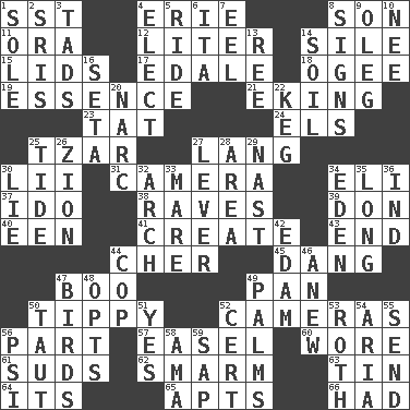 ACROSS 1. Fast jet (abbr.) 4. One of the Great Lakes 8. Boy, to dad 11. Mouth or opening 12. 61 cubic inches 14. Filth; sediment 15. Flaplike coverings 17. Peak District village in England 18. Double curve, resembling the letter S 19. Center 21. Supplementing with great effort 23. Make lace 24. Raised railways 25. Czar 27. Long (Scottish) 30. Cards in a Roman deck? 31. Device for capturing images 34. Biblical high priest 37. Wedding promise 38. All-night dance parties 39. Spanish title 40. Car or cant ending 41. Cause to be 43. Conclusion 44. "Mermaids" star 45. Mild oath, euphamism for damn 47. Sometimes accompanies a hiss 49. Baking dish 50. Likely to tip or tilt 52. Devices for capturing images 56. Role in a play 57. Artist's stand 60. Had on 61. Soap bubbles 62. Excessive but superficial compliments 63. Shallow baking pan 64. ___ a Wonderful Life 65. Tenement units (abbr.) 66. Possessed DOWN 1. Not divided or shared with others 2. Indian titles of respect 3. Small boys 4. Choose 5. Travel on or in a vehicle 6. Call ___ day 7. Snakelike fish 8. Attaches a signature 9. Cassini of fashion 10. Born 13. To separate or throw off 14. Land 16. Bristle 20. Drug cop 22. Barrel 25. Periodic rise and fall of the sea level 26. The Jewish people; Israel 27. Crowbar 28. Length times width 29. Political cartoonist Thomas 30. Untruth 32. Bowlike part 33. Female horse 34. Paradise 35. Protracted 36. Working for oneself (abbr.) 42. Dutch treat 44. Police officer (slang) 46. Afresh 47. Avian creatures 48. Elects 49. Insides of hands 50. Drawn tight 51. Consenting reply 52. Foregone conclusion 53. Writer of Portnoy's Complaint (1969) 54. Operatic vocal solo 55. Post 56. 23rd letter of the Greek alphabet 58. Nursemaid (var.) 59. Plant excrement