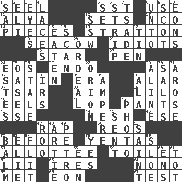 ACROSS 1. Sew up the eyelids of hawks and falcons 5. Fast jet (abbr.) 8. Purpose 11. Inventor's middle name 12. Puts into a specified state 13. Non-commissioned officer (abbr.) 14. Components 17. Ski resort town in Vermont 19. Manatee 21. Foolish or stupid persons 22. Play the lead 23. Writing instrument 24. Greek goddess of the dawn 27. Inside; within (prefix) 29. White ___ sheet 32. Smooth fabric 34. Epoch 36. Having or resembling wings 37. Russian ruler of old 38. Direct toward a target or goal 39. _ and Stitch 40. Snakelike fish 41. Trim (branches) 42. Leg coverings 43. Compass dir. 44. Tender 46. Compass dir. 47. Reproach for some lapse or misdeed 50. Vintage cars 52. Prior to 55. Gossips 57. One to whom something is allotted 59. Bathroom 62. Cards in a Roman deck? 63. Angers 64. Words to Nanette 65. Was introduced to 66. Period of immesurable duration 67. Trial DOWN 1. Plant excrement 2. Biblical high priest 3. Nights before holidays 4. Shoestrings 5. Put into a specified state 6. Empty completely 7. Sadhe (variant) 8. To (old English) 9. Highlander 10. Immeasurably long periods of time 12. Compass dir. 15. Ingested 16. Examine hastily 18. Metal container 20. Severe or trying experience 24. _____ Park, CO 25. Fertile tracts in a desert 26. Showing deterioration from age 28. Greek mythologigal hunter 29. Place in a line 30. Table seasonings 31. Came up 33. Big collection agency 35. Electrical Unit 36. In the manner of 42. Picture 45. Emitted 47. Friend of Pooh 48. Nick name for Arthur 49. Stone: prefix 51. Inhabitant of Heaven 52. Lip ointment 53. Writer Wiesel 54. Secret move to avoid paying debts 55. Affirmative reply 56. A type of plum 58. Car or cant ending 60. Followers of ems 61. Small child