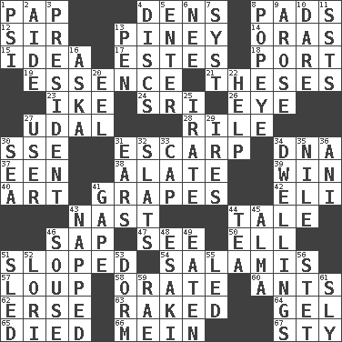 ACROSS 1. Infant food 4. Habitations of wild animals 8. Groovy apts. 12. Title for a knight 13. Abounding in pines 14. Mouths or openings 15. The main thing one is thinking about 17. _____ Park, CO 18. Sweet dark-red dessert wine 19. Center 21. College papers 23. Mamie's husband 24. Indian title of respect (Mr.) 26. Sight organ 27. Freehold land 28. Cause heat under the collar 30. Compass dir. 31. Fortification 34. Heredity factor (abbr.) 37. Car or cant ending 38. Having winglike extensions 39. Acquire through effort 40. Tate display 41. Wine fruits 42. Connecticut Ivy Leaguer 43. Political cartoonist Thomas 44. Story 46. Plant excrement 47. Perceive with the eye 50. Pipe bend 51. Had an oblique or slanted direction 54. Deli grouping 57. Central Nebraska county 58. Speak pompously 60. Pismires 62. Celtic language 63. Swept the length of 64. Set 65. Passed on 66. Chow _ 67. Filthy place DOWN 1. 23rd letter of the Greek alphabet 2. Assistant 3. Elected leader of a country 4. Plates 5. Keyboard key 6. Born 7. System (abbr.) 8. Wimpy's pal 9. Came up 10. Have the gumption 11. Fast planes 13. Writing instrument 16. "____ silly question..." 20. Snakelike fish 22. Assist 25. Feeling or showing extreme anger 27. One who makes use of a thing 29. Angers 30. Ocean 31. Hearing organs 32. Narrow boards 33. Head covering 34. Residences 35. Mediterranean tributary 36. Cuckoo 41. Yawn 43. Slept 44. Beverage made from leaves 45. _ mater 46. Lush 48. 1973 Nobel Price Winner (Physics) Leo 49. Consumed 51. Downhill vehicle 52. Australian parrot (variant) 53. Dormintory (informal) 55. Directed 56. Proofreading order 59. Actress Charlotte 61. Insidious