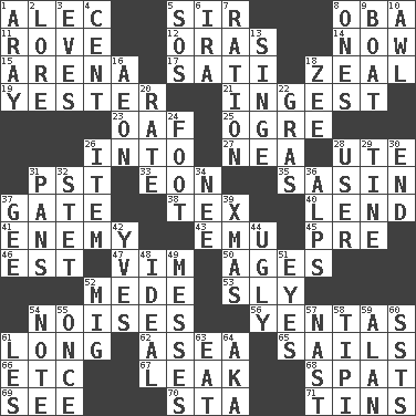 ACROSS 1. Actor Baldwin 5. Title for a knight 8. Chief or king in Benin or Nigeria 11. Be footloose 12. Mouths or openings 14. Immediately 15. Sports stadium 17. Suttee (variant) 18. Ardor 19. Last past 21. Consume 23. Clumsy lout 25. Legendary monster 26. To the inside or interior of 27. Teachers' org. 28. Shoshoni 31. Pacific Standard Time (abbr.) 33. Period of immesurable duration 35. Indian antelope 37. Yard entry 38. John Ritter's dad 40. Grant temporary use of 41. Foe 43. Australian flightless bird 45. Before (prefix) 46. Eastern Standard Time (abbr.) 47. Zeal 50. Matures 52. Ancient Persian 53. Secret 54. Annoying sounds 56. Gossips 61. Having great length 62. At sea 65. Moves on water 66. And so on (abbr.) 67. Path through which fluid escapes 68. Argument over a trivial matter 69. Observe 70. R.R. building 71. Metal containers DOWN 1. Like ___ of sunshine 2. Old wives' tales, e.g. 3. Nights before holidays 4. Penny 5. Distress signal 6. Retirement account (abbr.) 7. Food allowance for one day 8. Singles 9. Water vessel 10. Leather borer 13. Burn superficially 16. A really long time 18. Last letter of the English alphabet 20. Assign a rank or rating to 22. Pate de foie ____ 24. 12 inches 26. A whole individual unit 28. One who uses or employs something 29. Prong on a fork 30. Conclusion 31. Zero-star reviews 32. Proofreading order 34. Born 36. High mountains 37. Turn to the right 39. Dec. holiday 42. Jacques Cousteau's middle name 44. Repulsive 48. Standard of perfection 49. Makes clutter 51. Snake ____ (dice throw) 52. Russian fighter aircraft 54. Brief written record 55. Single time 57. Political cartoonist Thomas 58. Native american tent (variation) 59. Actor Alda or Thicke 60. Fast planes 61. French article 63. Ingest 64. Alias (abbr.)