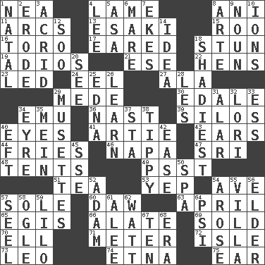 ACROSS 1. Teachers' org. 4. Unable to walk 8. Black tropical American cuckoo 11. Arches 13. 1973 Nobel Price Winner (Physics) Leo 15. Friend of Pooh 16. "Corrida" creature 17. Having ears or earlike features 18. Surprise greatly 19. Goodbye (Sp.) 21. Compass dir. 22. Coop moms 23. Directed 24. Snakelike fish 27. Insect wing 29. Ancient Persian 30. Peak District village in England 34. Australian flightless bird 36. Political cartoonist Thomas 39. Grain storage towers 40. Sight organs 41. Nick name for Arthur 43. Hearing organs 44. Strips of potato fried in deep fat 46. California wine valley 47. _ Lanka 48. Portable shelters 49. Inconspicuous attention getter 51. Beverage made from leaves 53. Slangy assent 54. "___ Maria" 57. Not divided or shared with others 60. Simpleton 63. Showery time 65. The front part of a cuirass 66. Having winglike extensions 69. Exchanged or delivered for money 70. Pipe bend 71. Distance measurement 72. Small island 73. Lion 74. Inactive volcano in Sicily 75. Ewer handle DOWN 1. Relating to or accompanying birth 2. Eat (away) 3. Sour-tasting 4. Area sheltered from the wind 5. White ___ sheet 6. Female horse 7. Supplements with great effort 8. Johnson of "Laugh-In" 9. Part of speech 10. Charged particles 12. "Barney Miller" actor Jack 14. The content of cognition 18. Most dubious of character or honesty 20. Observe 25. Pulitzer Prize-winning author Ferber 26. Memorize 28. French article 29. French bagpipes 31. Having or resembling wings 32. Australian parrot (variant) 33. Curvy letter 34. Jane of fiction 35. Count _ (2 wds.) 37. R.R. building 38. Likely to tip or tilt 40. Newt 42. Comfort 45. Compass dir. 50. Health resort 52. First man 54. Came up 55. Country estate 56. A person who is older than you are 57. Sew up the eyelids of hawks and falcons 58. Stare at amorously 59. _ and Stitch 61. Toward shelter 62. Electrical Unit 64. 23rd letter of the Greek alphabet 67. "___ Little Indians" 68. Epoch