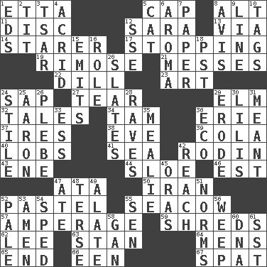 ACROSS 1. Singer James 5. Head covering 8. Keyboard modifier key 11. Compact _ 12. "Two Mules for Sister ____" 13. By way of 14. A viewer who gazes fixedly 17. Obstructing or blocking passage 19. Full of chinks, cracks, or crevices 21. Makes clutter 22. Deli pickle 23. Nonscientific branch of learning 24. Plant excrement 27. Lacerate 29. Shade tree 32. Falsehoods 34. Scottish cap 36. One of the Great Lakes 37. Angers 38. Night before a holiday 39. Root beer relative 40. Tennis shots 41. Ocean 42. "The Thinker" sculptor 43. Compass dir. 44. _ gin 46. Eastern Standard Time (abbr.) 47. "One Day ___ Time" 50. SW Asia republic 52. Soft color 55. Manatee 57. Electrical Measurement 59. Tears up 62. Area sheltered from the wind 63. Comedian Laurel of Laurel & Hardy 64. Not women's 65. Conclude 66. Car or cant ending 67. Argument over a trivial matter DOWN 1. Begley and Asner 2. Teat (slang) 3. Russian ruler of old 4. Bitter 5. Domesticated feline 6. Scent 7. Some stationery 8. Advice 9. Actor's bit 10. Labels 12. Compass dir. 15. Sends forth 16. Hero or heavy, e.g. 18. Pacific Standard Time (abbr.) 20. Chalkboards 24. Vertical member of a panel or frame 25. Composer Copland 26. First-year military academy student 28. All-night dance parties 29. Eat (away) 30. Ms. Damita and namesakes 31. Intended 33. Curvy letter 35. Ear of corn 36. Environmental prefix 42. Arrive at 45. Mouths or openings 47. Had dinner 48. Laconic 49. Having winglike extensions 51. Typical models 52. Light colored 53. So be it 54. Moved rapidly 55. Elected rep. 56. Shed a tear 58. Separate the seeds from cotton 60. Heredity factor (abbr.) 61. Fast jet (abbr.)