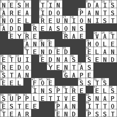 ACROSS 1. Tender 5. Metal container 8. Raised platform 12. Length times width 13. Wedding promise 14. Leg coverings 15. Christmas carol 16. One who advocates reunion 19. Find the sum of 20. Thinks logically 21. Jane of fiction 23. Actress Charlotte 24. Large container 27. Singer Murray 30. Undercover agent 31. Watched over 34. Liveliness 35. Needle case 38. Ferber et al. 40. Post 41. Make new 42. Gossips 44. Comedian Laurel of Laurel & Hardy 45. Open wide 46. Snakelike fish 47. Enemy 50. Fast planes 53. Motivate 57. Raised railways 59. Supplying deficiencies 63. Fastener 64. First name in cosmetics 65. Baking dish 66. "Tell ____ the Marines!" 67. Lacerate 68. Conclude 69. Inconspicuous attention getter DOWN 1. Nanny 2. Wear away 3. Morally degraded 4. Actor Linden 5. Become fatigued 6. The main thing one is thinking about 7. Horse sense 8. Daniel's nick name 9. Black tropical American cuckoo 10. ___ a Wonderful Life 11. Fast jet (abbr.) 14. Airs 17. And not 18. _ tizzy (2 wds.) 20. French philosopher Descartes 22. Food allowance for one day 24. Grand slam 25. Actor Alda or Thicke 26. Look after 28. Compass dir. 29. Whirlpool 30. Makes clutter 32. Compass dir. 33. Mild oath, euphamism for damn 35. Celtic language 36. False hair 37. Allodial 39. R.R. building 43. Domed church section 47. Do some clerical work 48. Single 49. Eastern Standard Time (abbr.) 51. Portable shelters 52. Narrow boards 54. Corncob 55. _ the terrible 56. Tear apart 58. Specific locale 59. Put into a specified state 60. Purpose 61. Parent Teacher Association (abbr.) 62. For each 63. Small drink