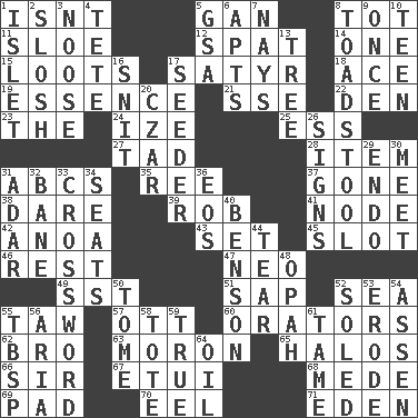 ACROSS 1. Is not 5. Separate the seeds from cotton 8. Small child 11. _ gin 12. Petty quarrel 14. Single 15. Plunders 17. Letch 18. Adept person 19. Core 21. Compass dir. 22. Lair 23. Definite Article 24. Ending with capital 25. Curvy letter 27. Small boy 28. A distinct part 31. Lettered men learn these first 35. To separate or throw off 37. Went 38. Have the gumption 39. Director Reiner 41. Thickened enlargement 42. Small Philippine buffalo 43. Arrange properly for use 45. Position in a hierarchy or organization 46. State of inaction 47. Modern: prefix 49. Fast jet (abbr.) 51. Plant excrement 52. Ocean 55. The 23rd letter of the Hebrew alphabet 57. Baseball player Mel 60. Speakers 62. Sis' sibling 63. Person of subnormal intelligence 65. Auras 66. Title for a knight 67. Needle holder 68. Ancient Persian 69. Groovy apt. 70. Snakelike fish 71. Paradise DOWN 1. Small island 2. Make a splashing sound 3. Trap for birds or small mammals 4. False hair 5. Girls' org. (abbr.) 6. Flats, for short 7. Negative votes 8. Inedible or poisonous agaric 9. Single time 10. Adolescent 13. Relationship diagram 16. In a ____ (agitated or irritated) 17. Sowing specialist 20. Russian ruler of old 26. Public displays of written messages 29. Inside; within (prefix) 30. Confront 31. The sixth month of the Jewish calendar 32. Object of repulsion 33. What you're doing now 34. Theater features 36. Greek goddess of the dawn 40. Gillaume's butler role 44. Rend 48. Brightly colored fish 50. Heavy book 52. Having a sole or soles 53. Wear away 54. NE Netherlands city 55. Cook's measure (abbr.) 56. Operatic vocal solo 58. Lug 59. Loyal 61. Not wild 64. Lubricate