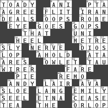 ACROSS 1. Sycophant 6. Cuckoo 9. Parent Teacher Association (abbr.) 12. Match 13. Sudden quick movement 14. SW Asia republic 15. Allots cards 16. I made a mistake 17. Loose flowing garment 18. Sight organ 19. Moves 20. Republicans 21. Not this but _ 23. University (slang) 24. The bottom of a shoe or boot 25. Distance measurement (Brit.) 28. Stealthy 30. Boldness 34. "Vaya con ____" 35. Chop off 36. Hold, grip (Informal) 38. _ moment's notice (2 wds.) 39. Ancient Greek god of war 41. A small or young owl 43. The 19th letter of the Greek alphabet 44. One who wires 46. Conductor's collection 48. Sliced dessert 49. San ____ (Riviera town) 50. Actor Griffith 51. Den 53. Actress Gardner 56. A type of plum 57. Long (Scottish) 58. Poet Dickinson 60. Sew up the eyelids of hawks and falcons 61. Inactive volcano in Sicily 62. Desist 63. Afternoon social gathering 64. Definite Article 65. Lowest deck of a ship DOWN 1. Bit 2. Double curve, resembling the letter S 3. Like ___ of sunshine 4. Erase 5. Affirmative reply 6. _ vera 7. Pinches, bites 8. ___ a Wonderful Life 9. Appease 10. Bar bills 11. One (Scot) 13. Pick up the tab 14. Pressed 19. An organ shaped like a helmet 20. Chewing product 22. Layer 24. Abnormally rapid or deep breathing 26. Roll call or roster of names 27. Son of Isaac 28. Cole _ (cabbage dish) 29. Australian parrot (variant) 31. 17th letter of the Greek alphabet 32. Promise 33. Pipe bend 37. Put off 40. A glass for beer 42. Scottish cap 45. Marina Del _, California 47. Wanderer 49. Capital of Latvia 50. Toward shelter 51. Thin strip of wood or metal 52. Queen of England 1702-14 54. Small bottle 55. In addition 56. Fast jet (abbr.) 57. Allow 58. Environmental prefix 59. Slangy assent