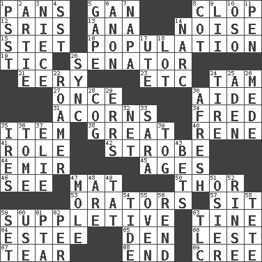 ACROSS 1. Baking dishes 5. Separate the seeds from cotton 8. Hoof sound 12. Indian titles of respect 13. Santa ___, CA 14. Annoying sound 15. Proofreading order 16. Census information 19. Nervous spasm 20. Legislator 21. Suggestive of the supernatural 23. And so on (abbr.) 24. Scottish cap 27. Single time 30. Assistant 31. Oak nuts 34. Flintstone 35. A distinct part 38. Relatively large 40. French philosopher Descartes 41. Hero or heavy, e.g. 42. Disco prop 44. Independent ruler or chieftain 45. Matures 46. Observe 47. Floor protector 50. Son of Odin 53. Speakers 57. Be seated 59. Supplementary 63. Prong on a fork 64. First name in cosmetics 65. Lair 66. For fear that 67. Separate forcefully 68. Conclusion 69. Algonquian DOWN 1. Inconspicuous attention getter 2. Nick name for Arthur 3. Sibling's daughter 4. Fast jet (abbr.) 5. Yawn 6. At once, immediately (arch.) 7. California wine valley 8. Small bed 9. Cards in a Roman deck? 10. Bear (Spanish) 11. Writing instrument 14. Drug cop 17. Shoshoni 18. Car dealer's back yard 20. Synchronize (abbr.) 22. Wanderer 24. Become fatigued 25. An important port of Yemen 26. Ancient Persian 28. Gear tooth 29. Blunders 30. Anew 32. Remaining after all deductions 33. "Two Mules for Sister ____" 35. Angers 36. Heavy book 37. Writer Wiesel 39. Coat; cloak 43. Wagers 47. Undercover agent 48. "We ___ not amused" (Victoria) 49. Make lace 51. Flexible twig of a willow tree 52. Wash lightly 54. Event that recurs at intervals 55. Baking chamber 56. Tear apart 58. False hair 59. Put into a specified state 60. Purpose 61. Parent Teacher Association (abbr.) 62. For each 63. Affectionate concern, for short