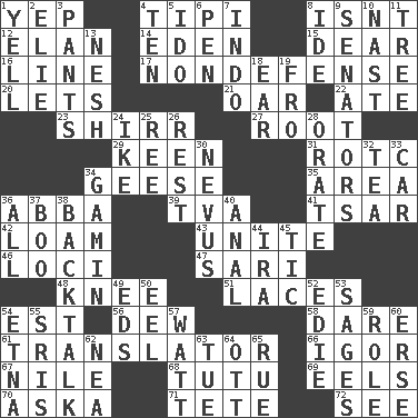 ACROSS 1. Slangy assent 4. Native american tent (variation) 8. Is not 12. Enthusiasm 14. Genesis locale 15. Letter starter 16. Actor's bit 17. Unrelated to defense, as in spending 20. Allows 21. Rowing implement 22. Had dinner 23. Bake eggs in their shells 27. Carrot, for example 29. Peachy ____! 31. College mil. group 34. Honkers 35. Type of rug 36. Swedish rock group 39. Federal power corp. 41. Russian ruler of old 42. Rich soil 43. Join together 46. Locales 47. Indian skirt 48. Leg joint 51. Shoestrings 54. Eastern Standard Time (abbr.) 56. Morning condensation 58. Have the gumption 61. Interpreter 66. Composer Stravinsky 67. Mediterranean tributary 68. Ballerina skirt 69. Snakelike fish 70. "____ silly question..." 71. False hair 72. Observe DOWN 1. Shout 2. Writer Wiesel 3. Leg coverings 4. Nine, plus one 5. Wedding promise 6. Fenced enclosure 7. Southeast Asian peninsula 8. Binary compound 9. Elected representatives 10. Political cartoonist Thomas 11. Relationship diagram 13. Tender 18. Hearing organ 19. Away 24. D.D.E's nickname 25. To riddle 26. Remainder 28. Speak pompously 30. Mole, birthmark 32. Beverage made from leaves 33. Automobile 34. Street urchin 36. 100% 37. Sometimes accompanies a hiss 38. Sass 40. Of or related to the anus 44. Lyricist Gershwin 45. Nervous spasm 49. Begley and Asner 50. Snakelike fish 52. Singer Brickell 53. Gurus 54. Inactive volcano in Sicily 55. Indian titles of respect 57. Electrical Unit 59. Hero or heavy, e.g. 60. Celtic language 62. Teachers' org. 63. Third day of the wk. 64. Baseball player Mel 65. Regret